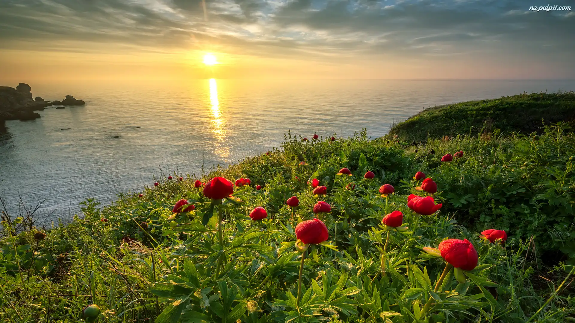 Bułgaria, Morze Czarne, Piwonie, Wzgórze, Góry, Wschód słońca, Kwiaty Na Pulpit