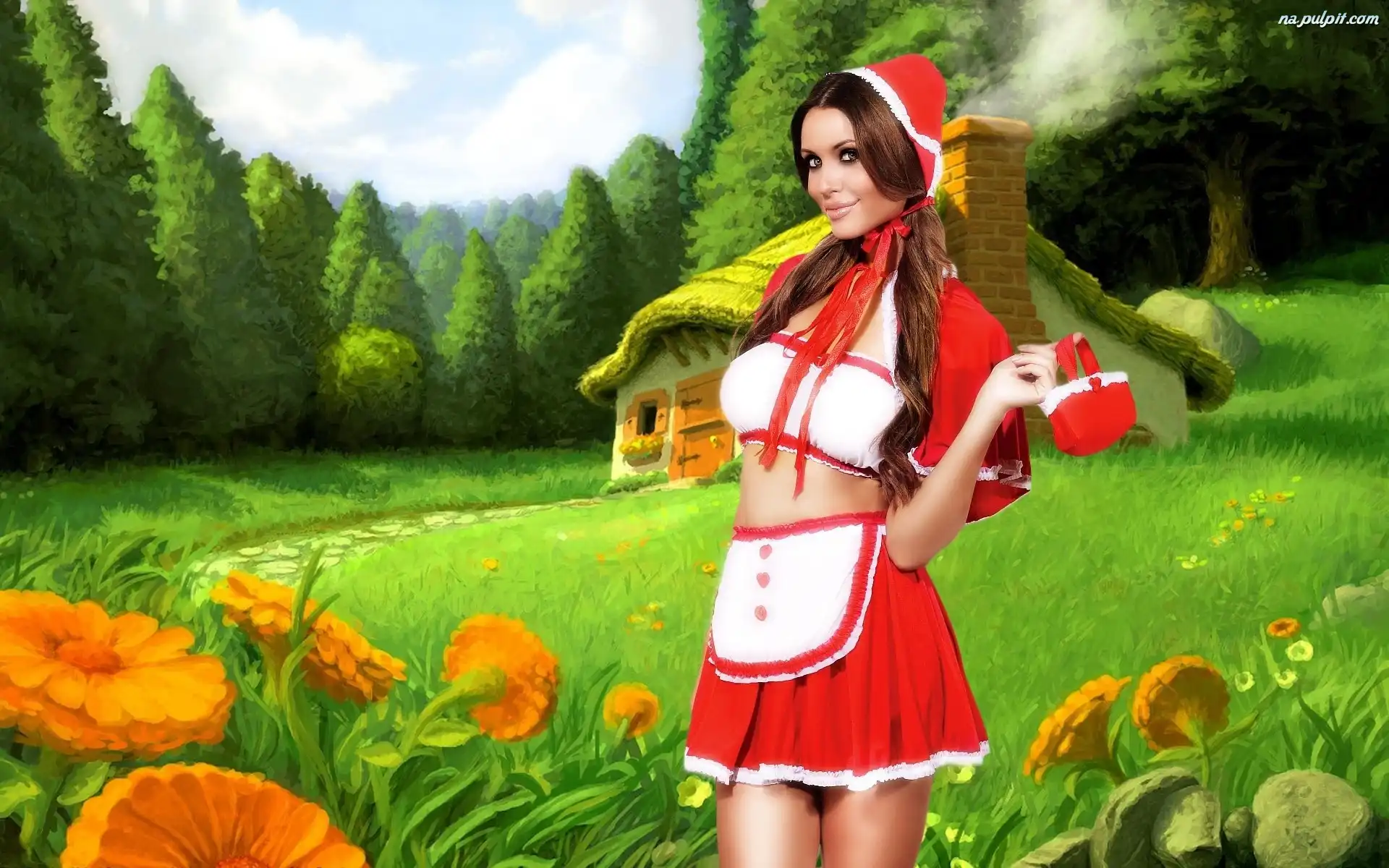 Czerwony Kapturek, Las, Kwiaty, Cosplay, Kobieta, Chatka Na Pulpit