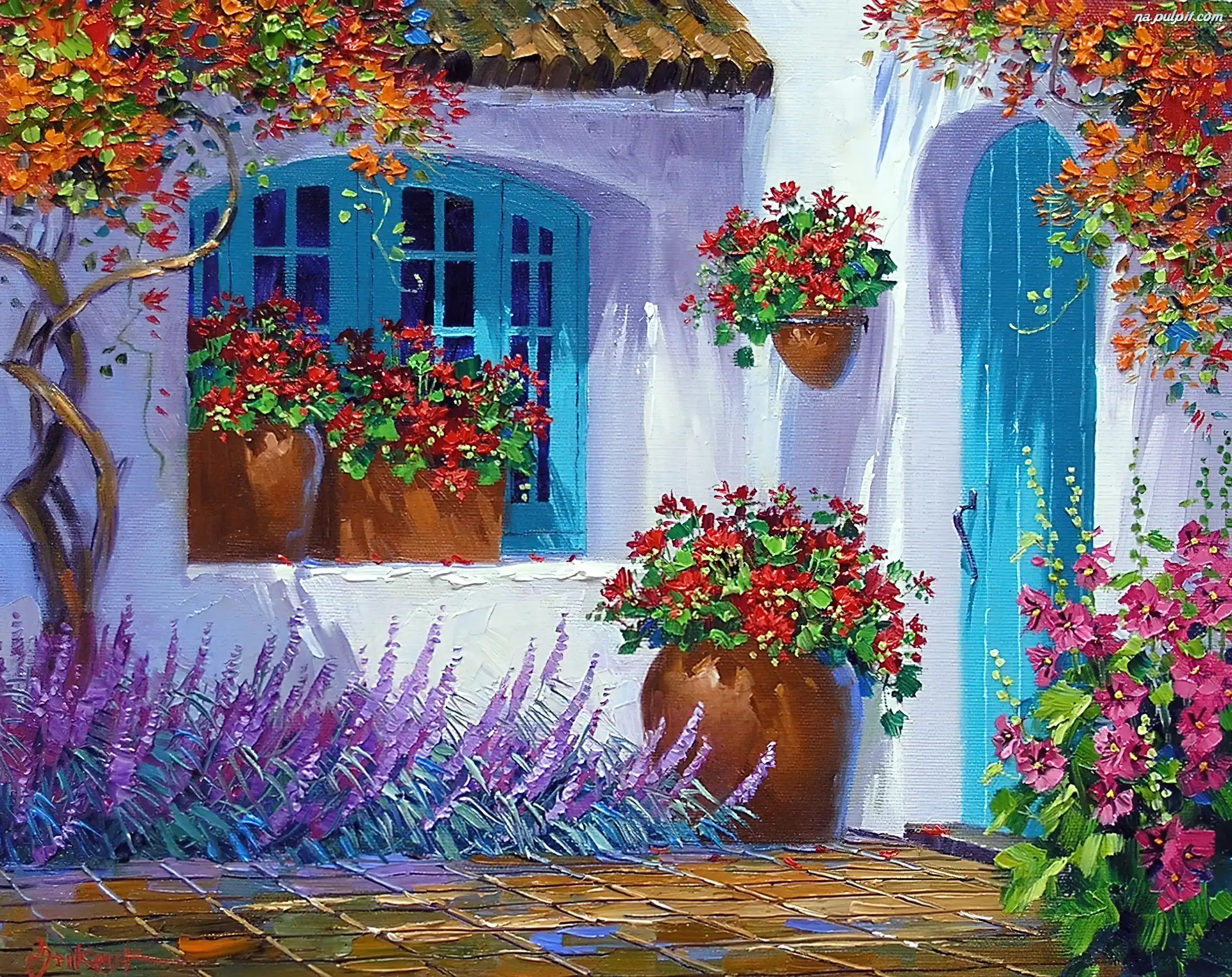 Kwiaty, Drzwi, Niebieskie, Dom, Okno Na Pulpit