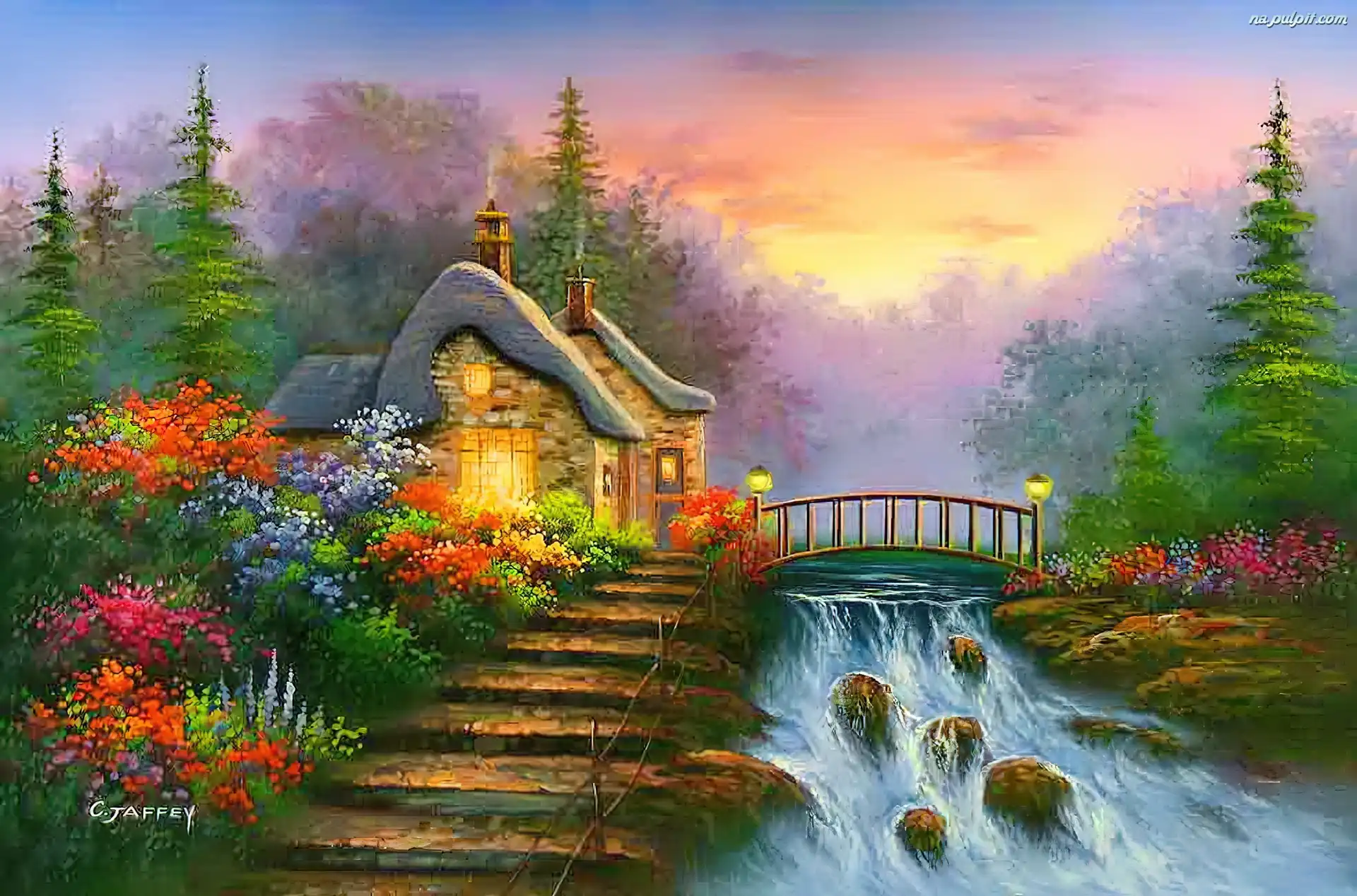 Kwiaty, Rzeka, Schody, Dom, Most Na Pulpit