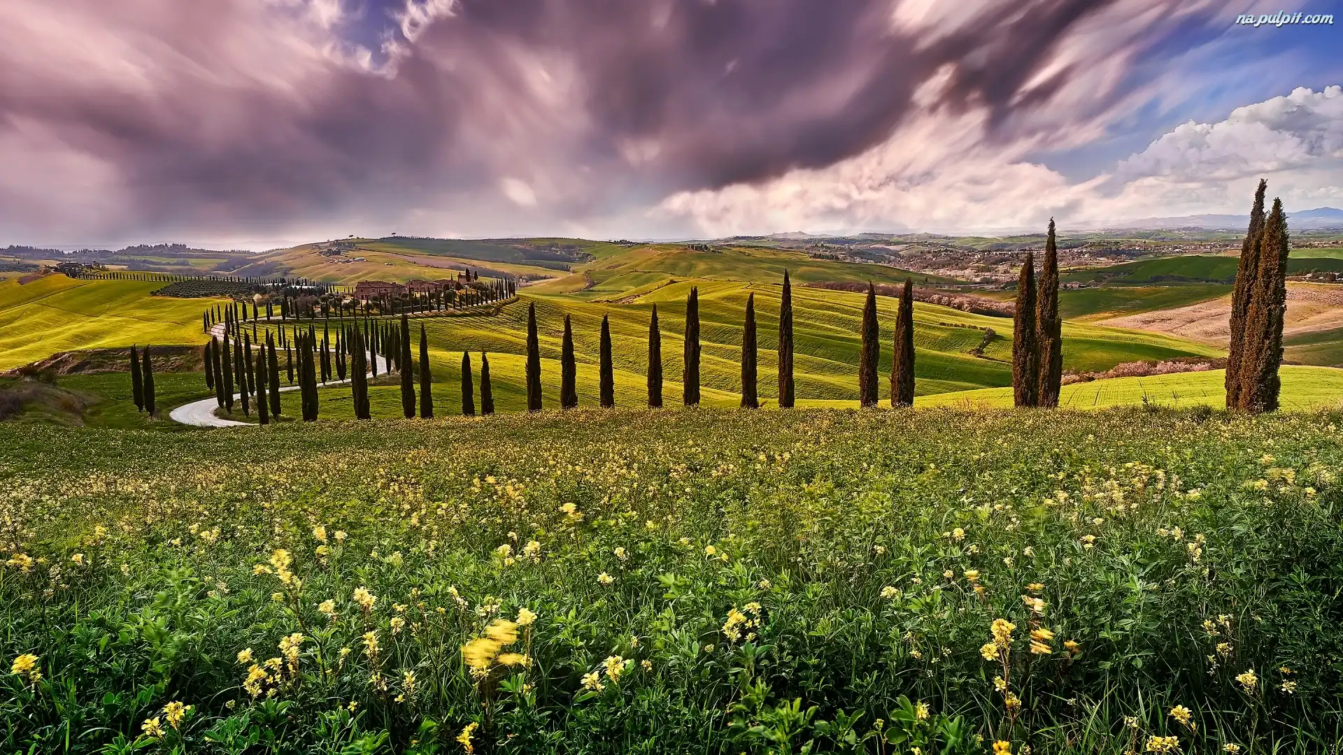 Chmury, Droga, Drzewa, Cyprysy, Toskania, Włochy, Łąka, Wzgórza, Kwiaty Na Pulpit