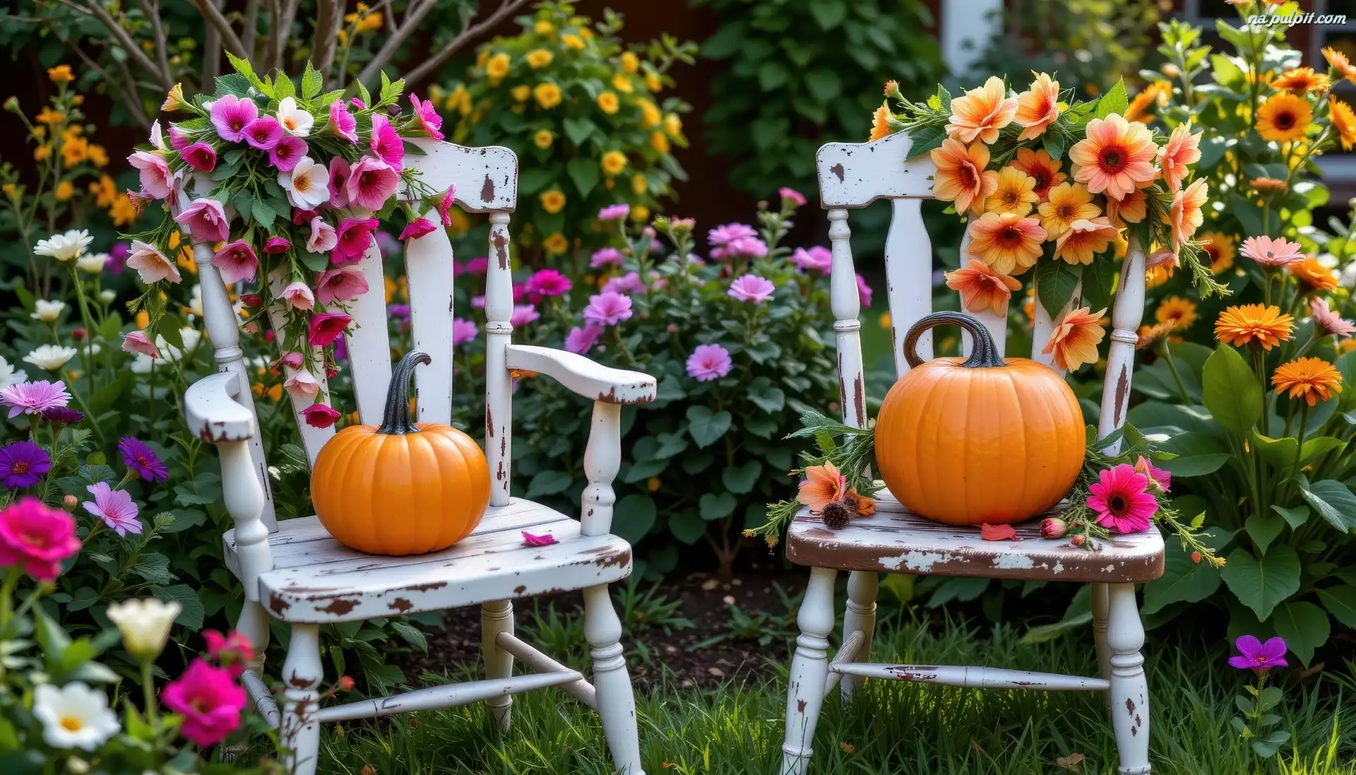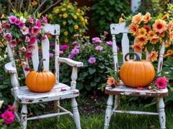 Dwa, Krzesła, Dynie, Kwiaty