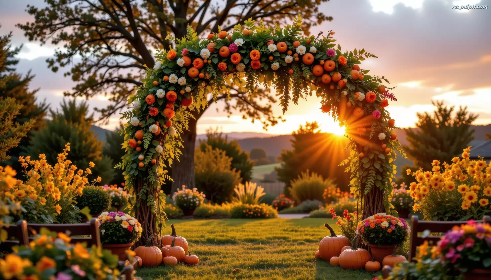 Zachód słońca, Łuk, Kwiaty, Ogród, Dynie