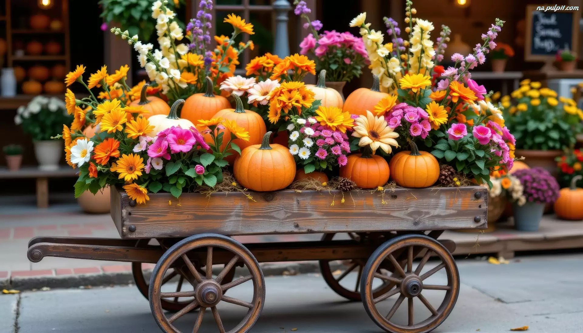 Drewniany, Kwiaty, Dynie, AI, Wózek