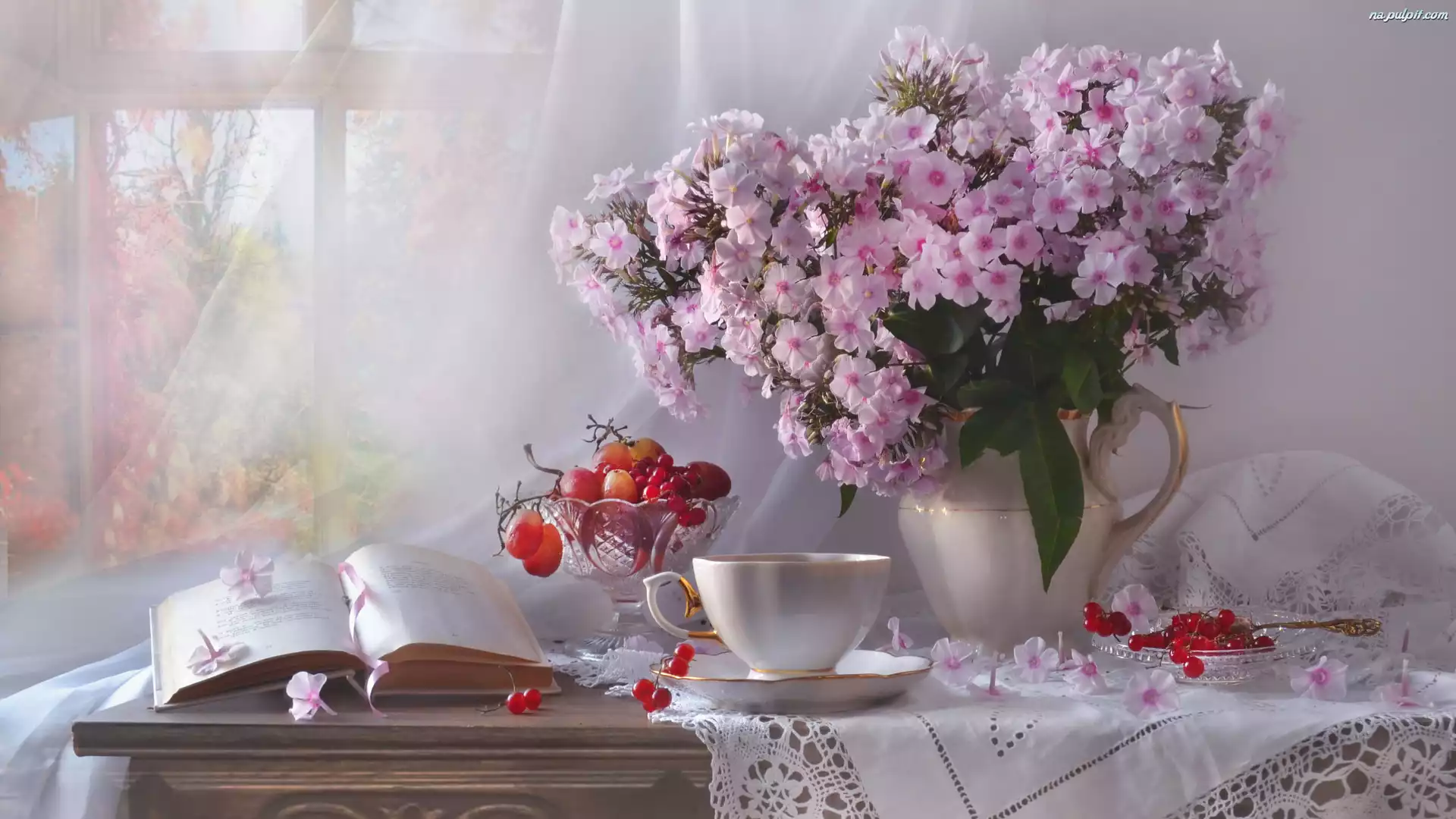 Serweta, Floksy, Kompozycja, Bukiet, Filiżanka, Winogrona, Kwiaty, Dzbanek, Książka, Czerwona porzeczka Na Pulpit |
