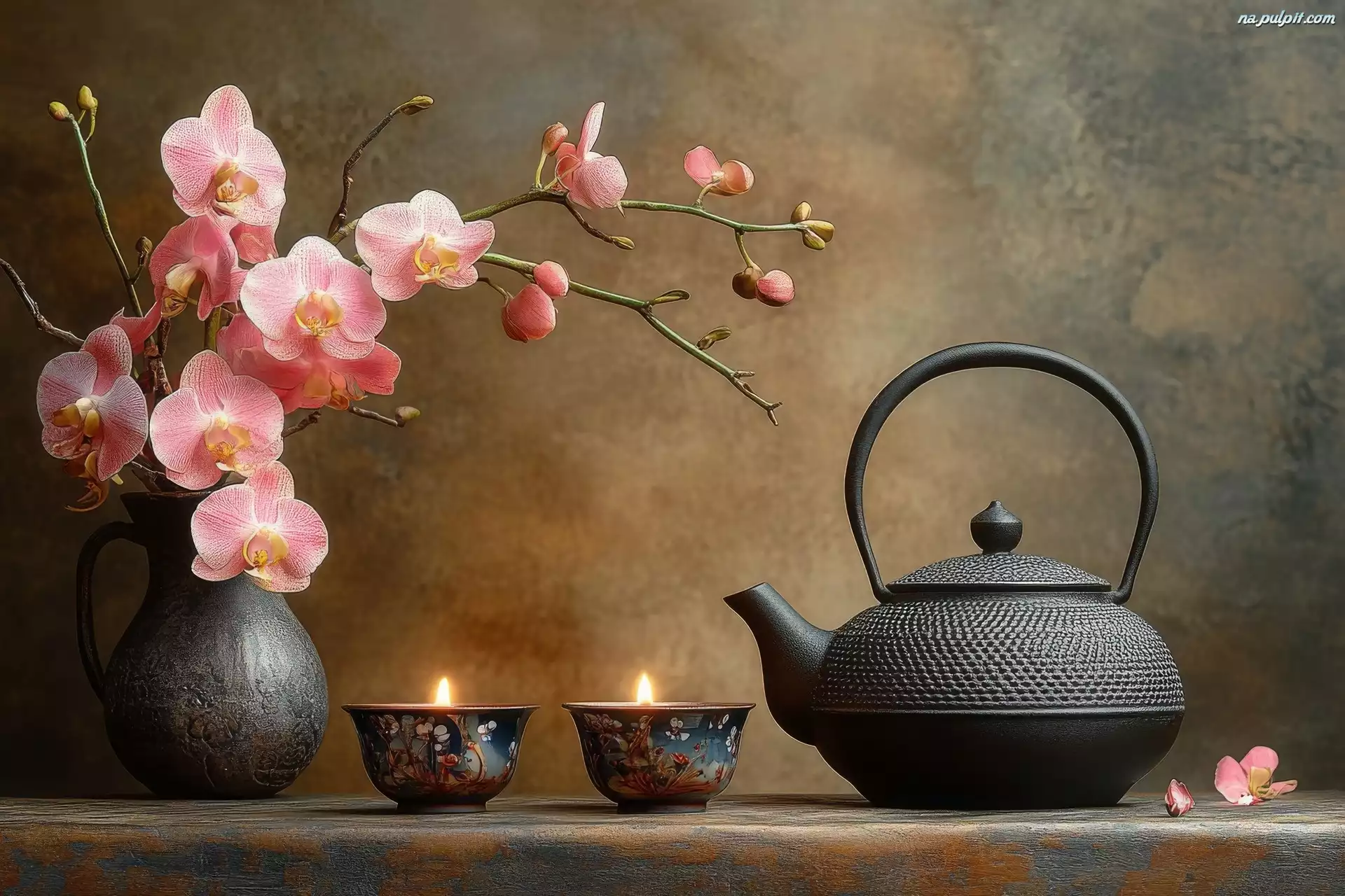 Kompozycja, Świece, Dzbanek, Kwiaty, Storczyki, Różowe, Czajnik Na Pulpit