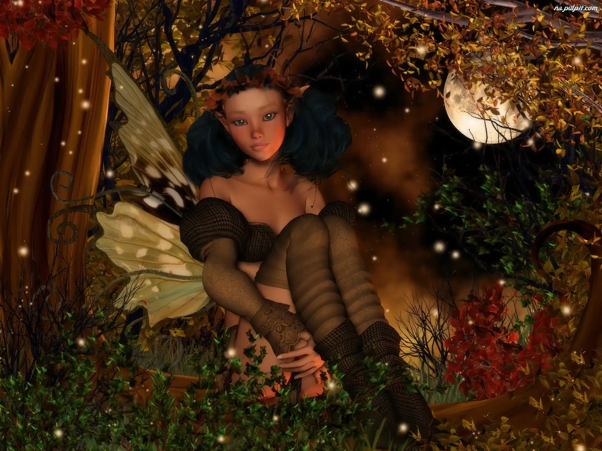 Kwiaty, Motyl, Dziewczyna, Księżyc Na Pulpit