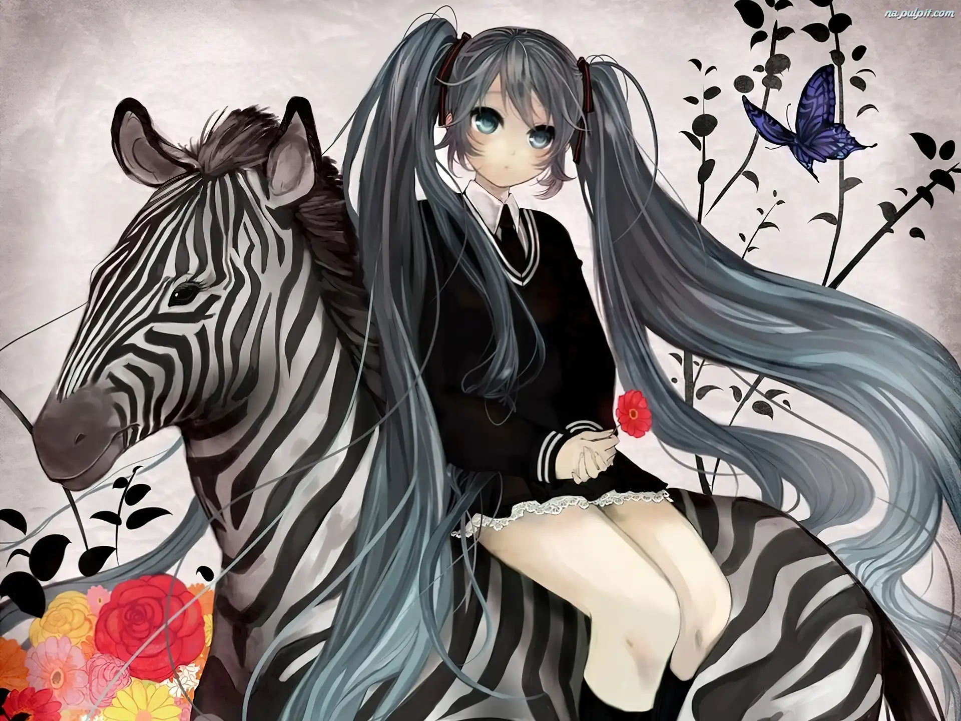 Kwiaty, Motyl, Dziewczyna, Zebra Na Pulpit