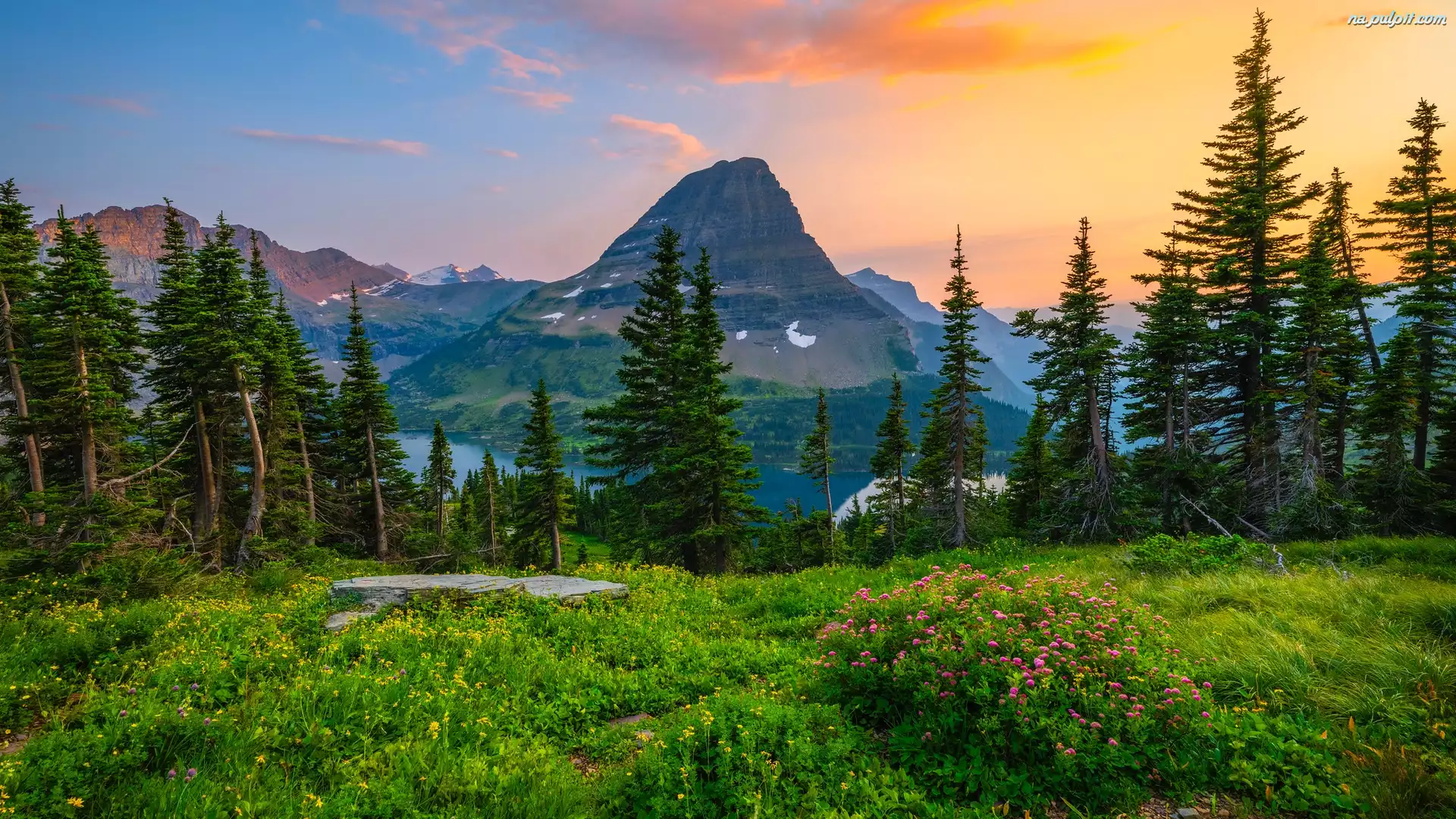 Kwiaty, Drzewa, Góry, Stany Zjednoczone, Montana, Park Narodowy Glacier, Łąka Na Pulpit