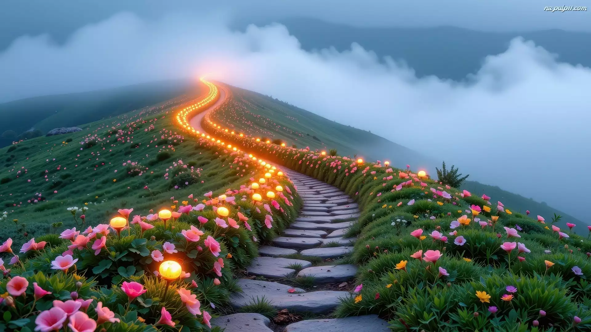 Mgła, Droga, Grafika AI, Kamienista, Lampy, Kwiaty, Góra, Ścieżka, Kolorowe, Opadająca Na Pulpit