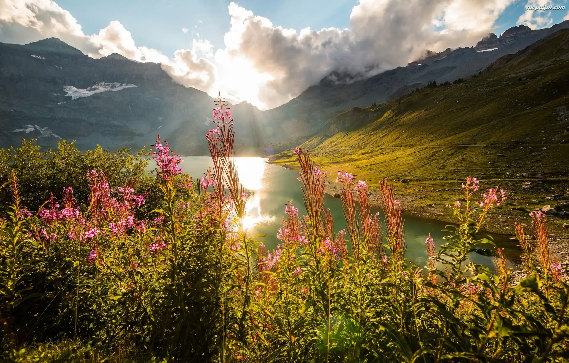 Jezioro Lac de Salanfe, Góry Alpy, Wschód słońca, Szwajcaria, Kwiaty Na Pulpit