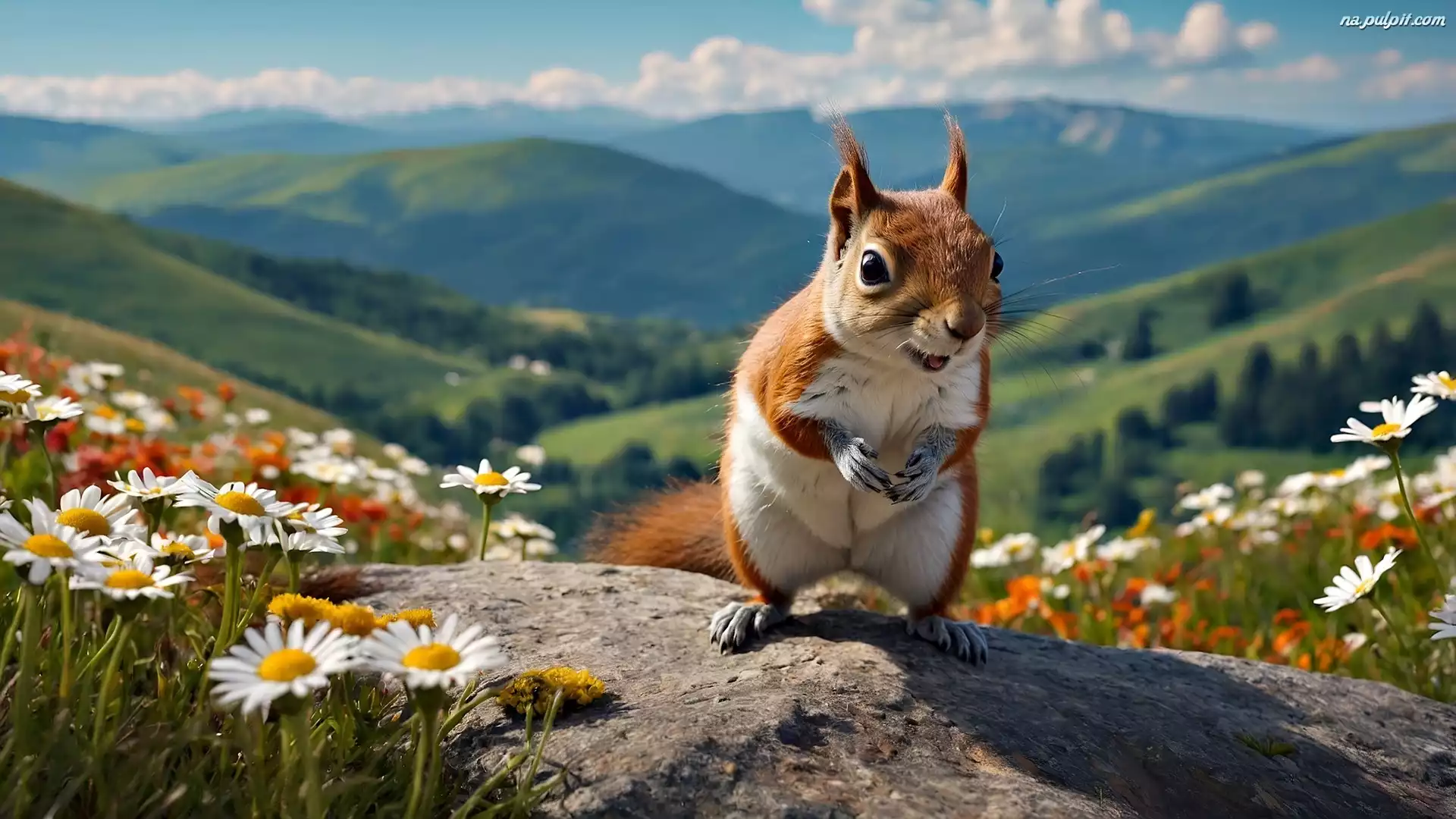 Stokrotki, Wiewiórka, Głaz, Kwiaty, Kamień, Góry Na Pulpit