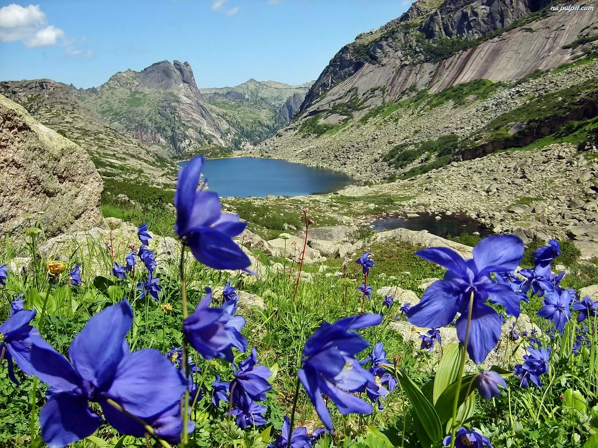 Kwiaty, Łąka, Jezioro, Góry, Niebieskie Na Pulpit