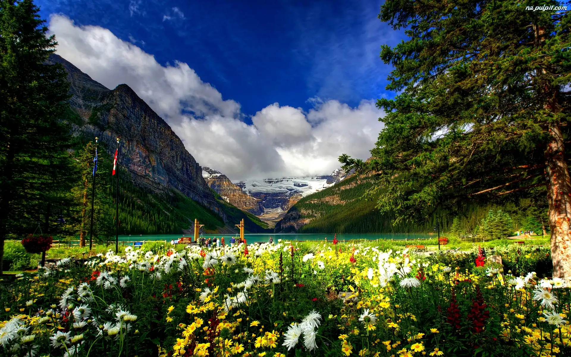 Kwiaty, Park, Jezioro, Góry, Kolorowe Na Pulpit