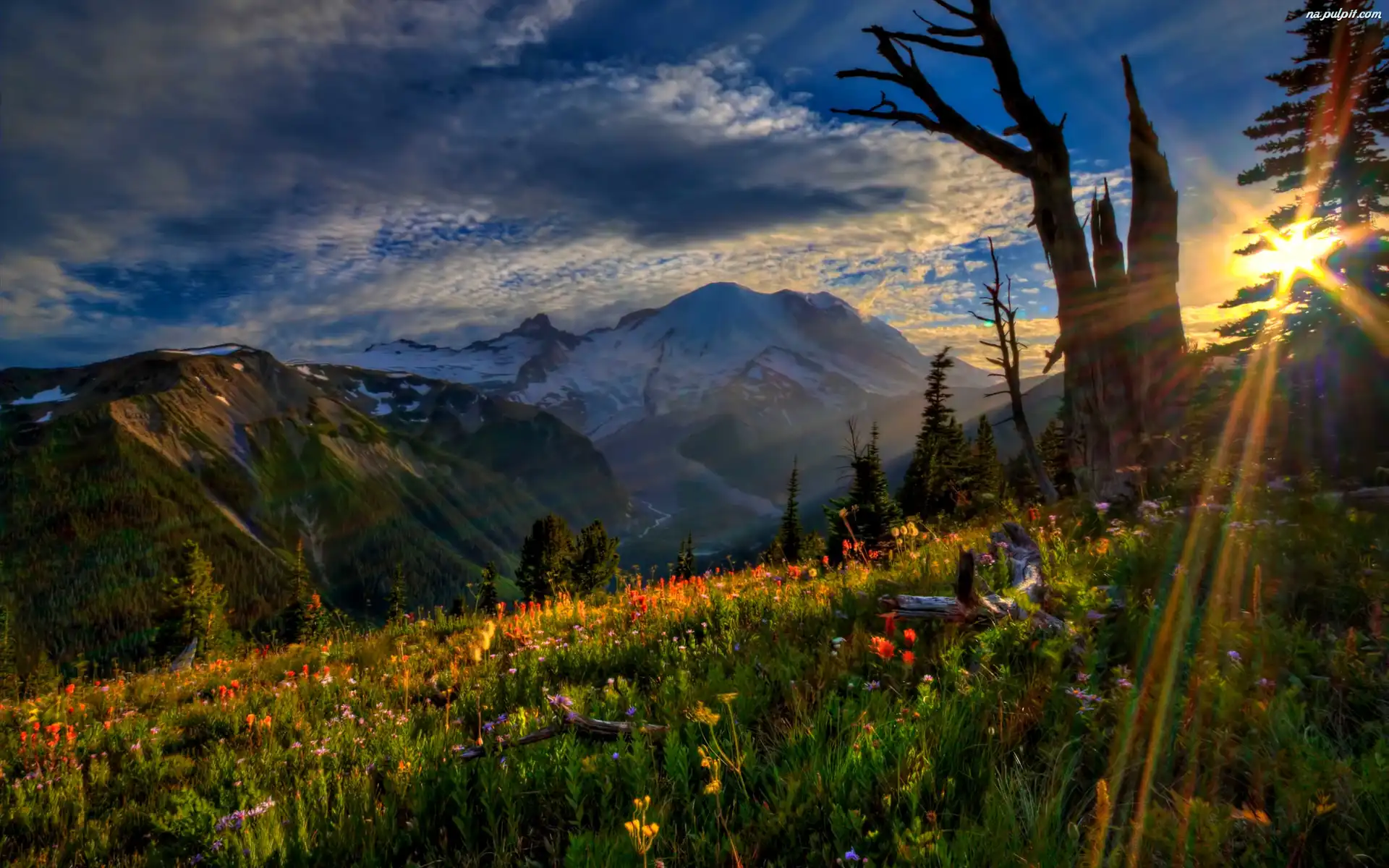 Kwiaty, Słońca, Promienie, Góry, Trawa Na Pulpit