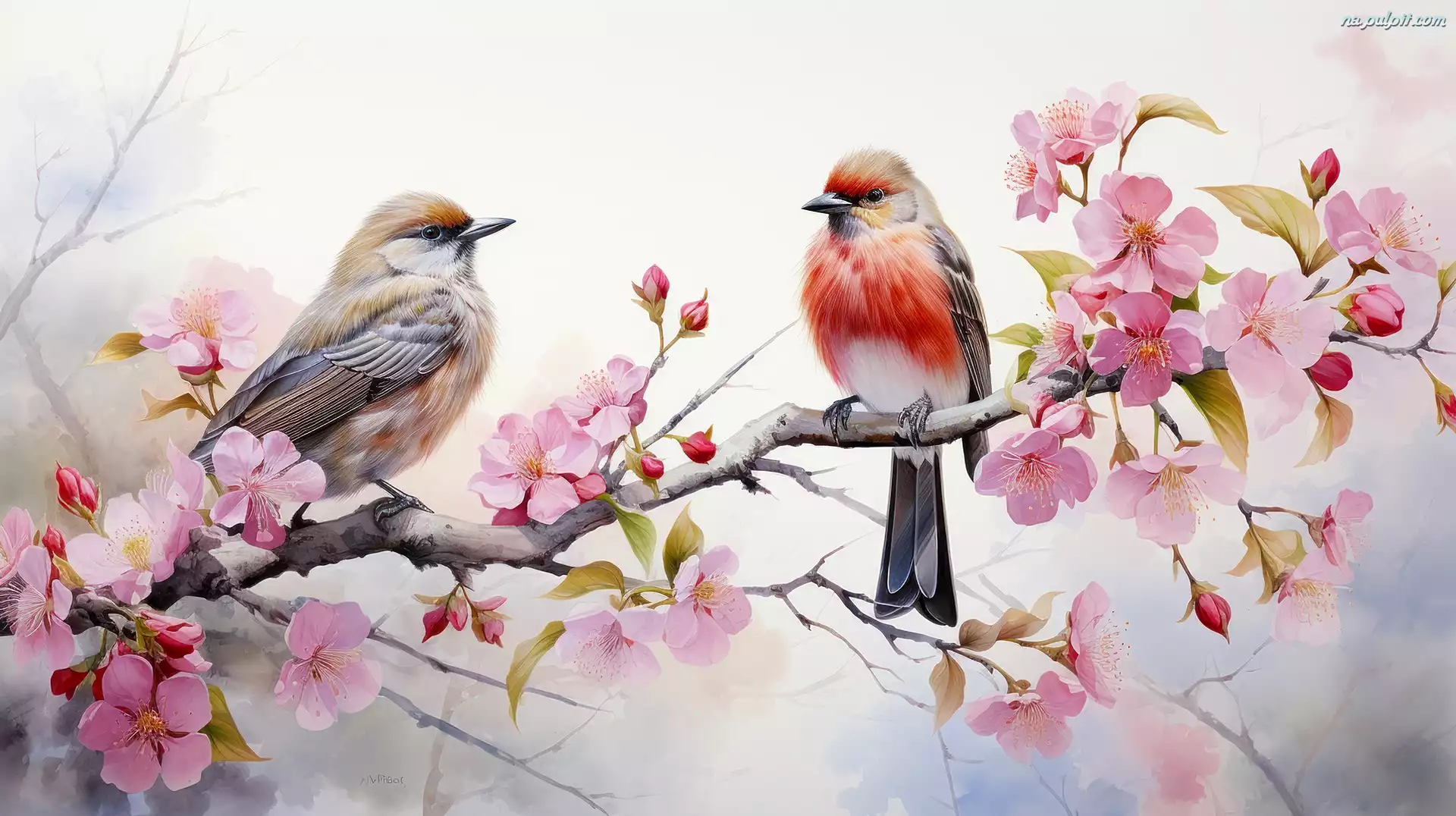 Wiosna, Kolorowe, Gałąź, Kwiaty, Ptaki, Grafika Na Pulpit
