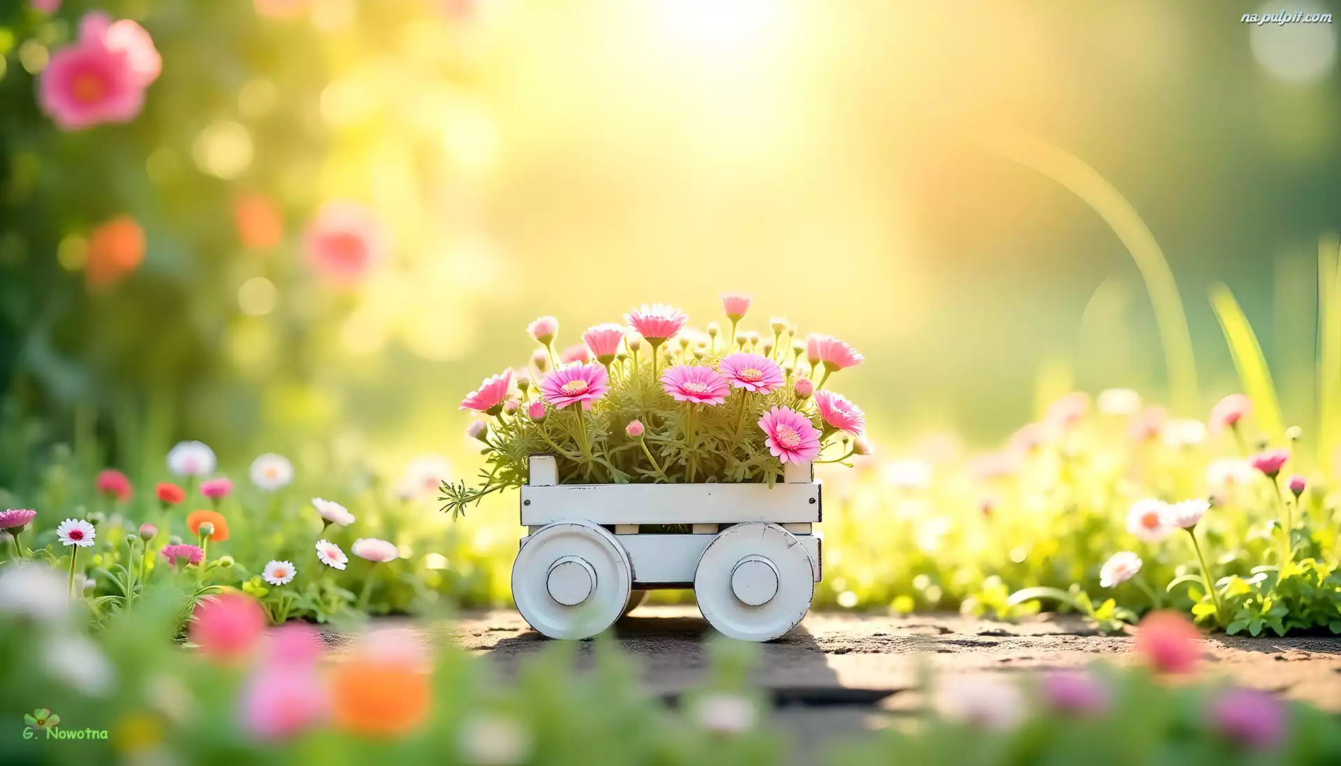 Ogród, Biały, Różowe, Kwiaty, Wózek, Grafika Na Pulpit