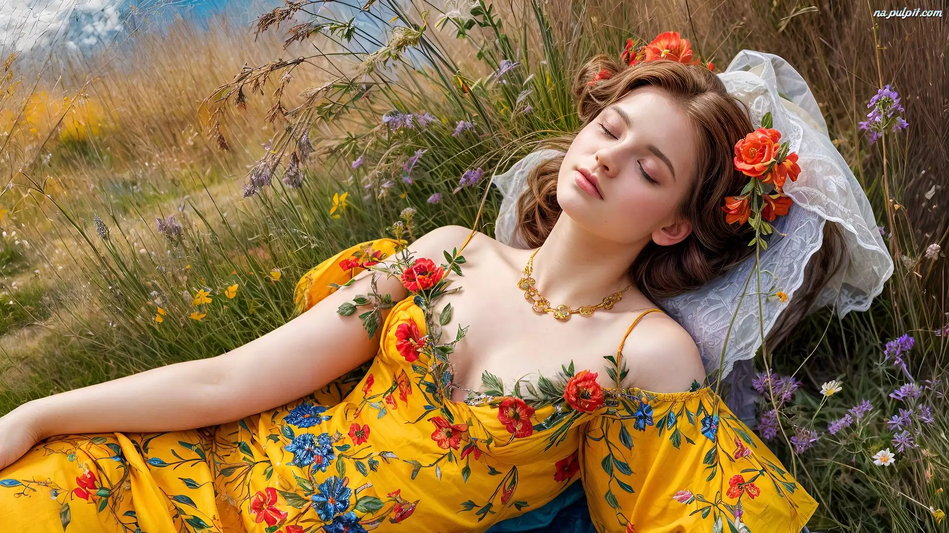 Łąka, Śpiąca, Sukienka, Kwiaty, Kobieta, Grafika Na Pulpit