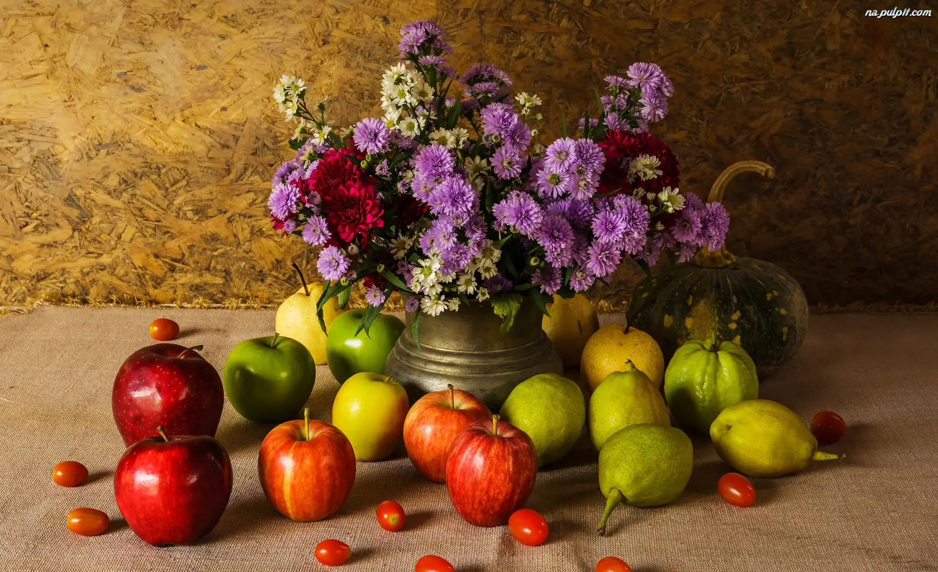 Wazon, Owoce, Kwiaty, Bukiet, Gruszki, Warzywa, Dynia, Astry marcinki, Kompozycja, Jabłka Na Pulpit |