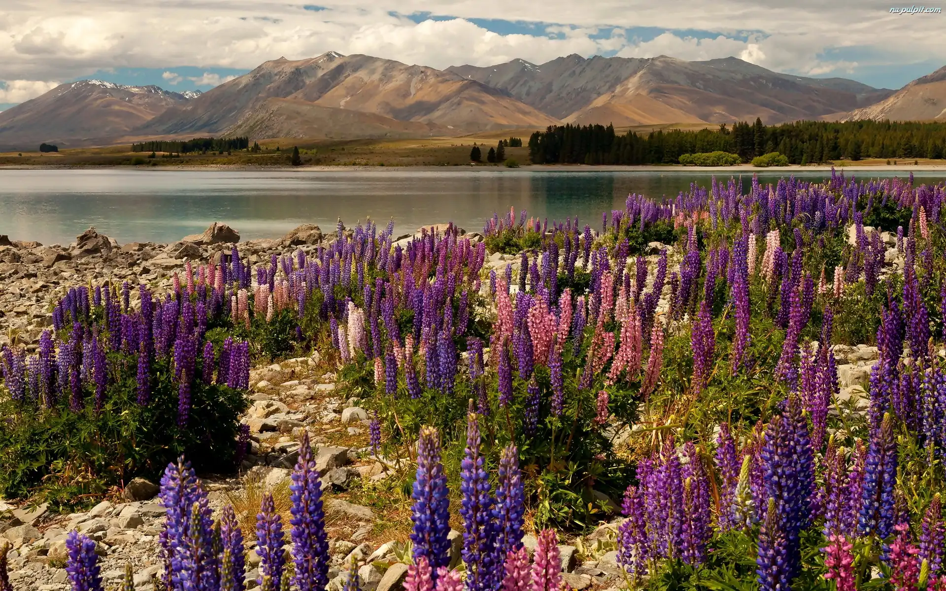 Jezioro, Kwiaty, Łubin, Góry, Nowa Zelandia, Brzeg Na Pulpit