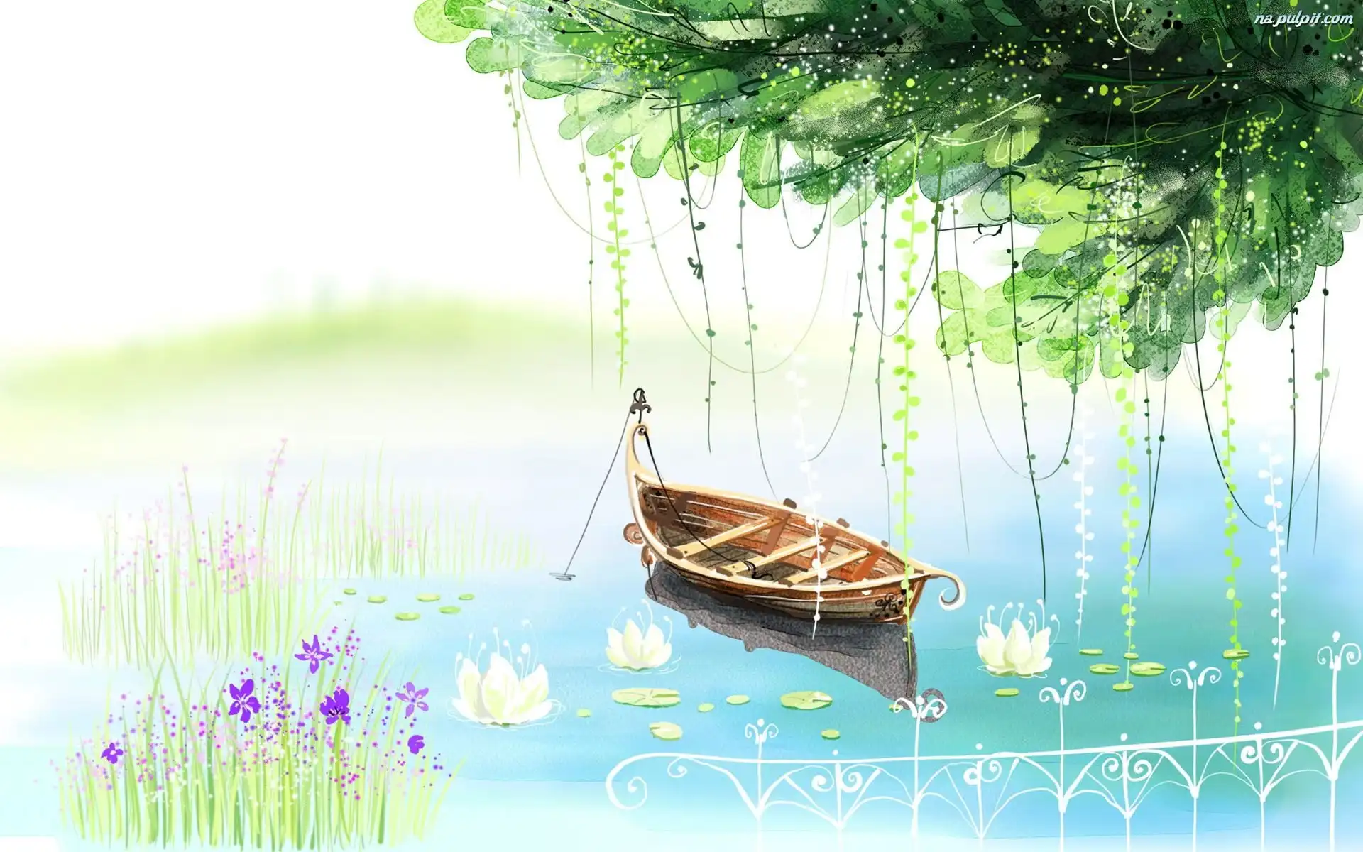 Kwiaty, Łódka, Jezioro, Drzewo Na Pulpit