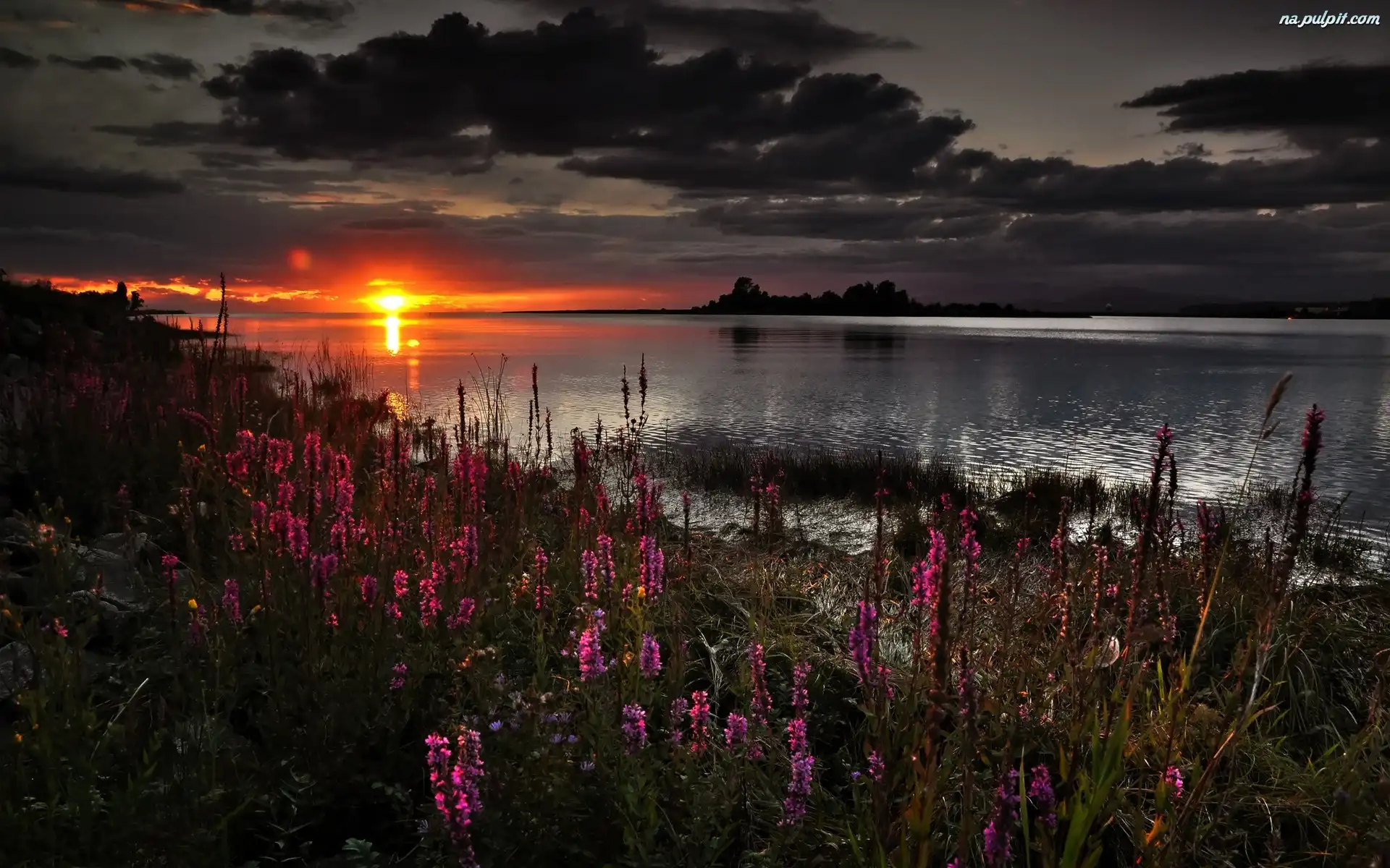 Kwiaty, Zachód, Jezioro, Słońca Na Pulpit