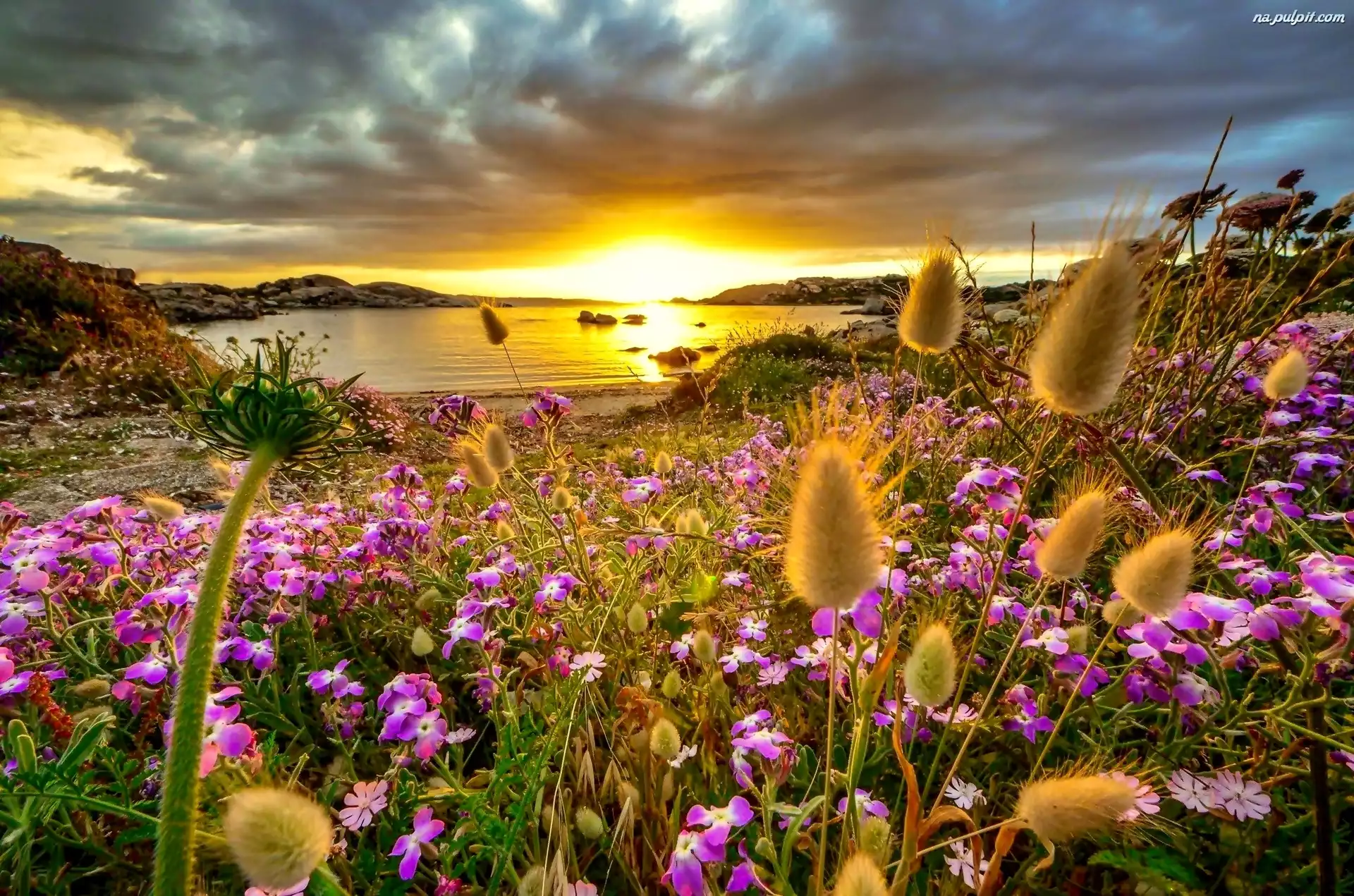 Kwiaty, Zachód, Jezioro, Słońca Na Pulpit