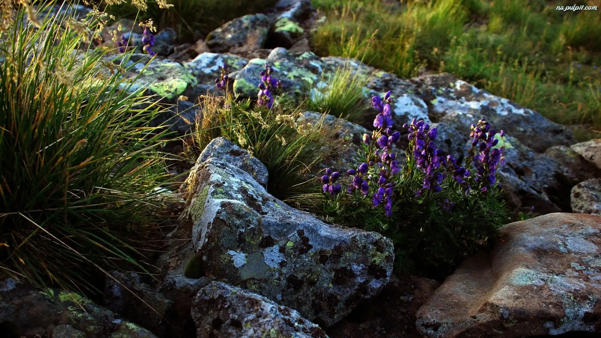 Kwiaty, Trawa, Kamienie, Fioletowe Na Pulpit