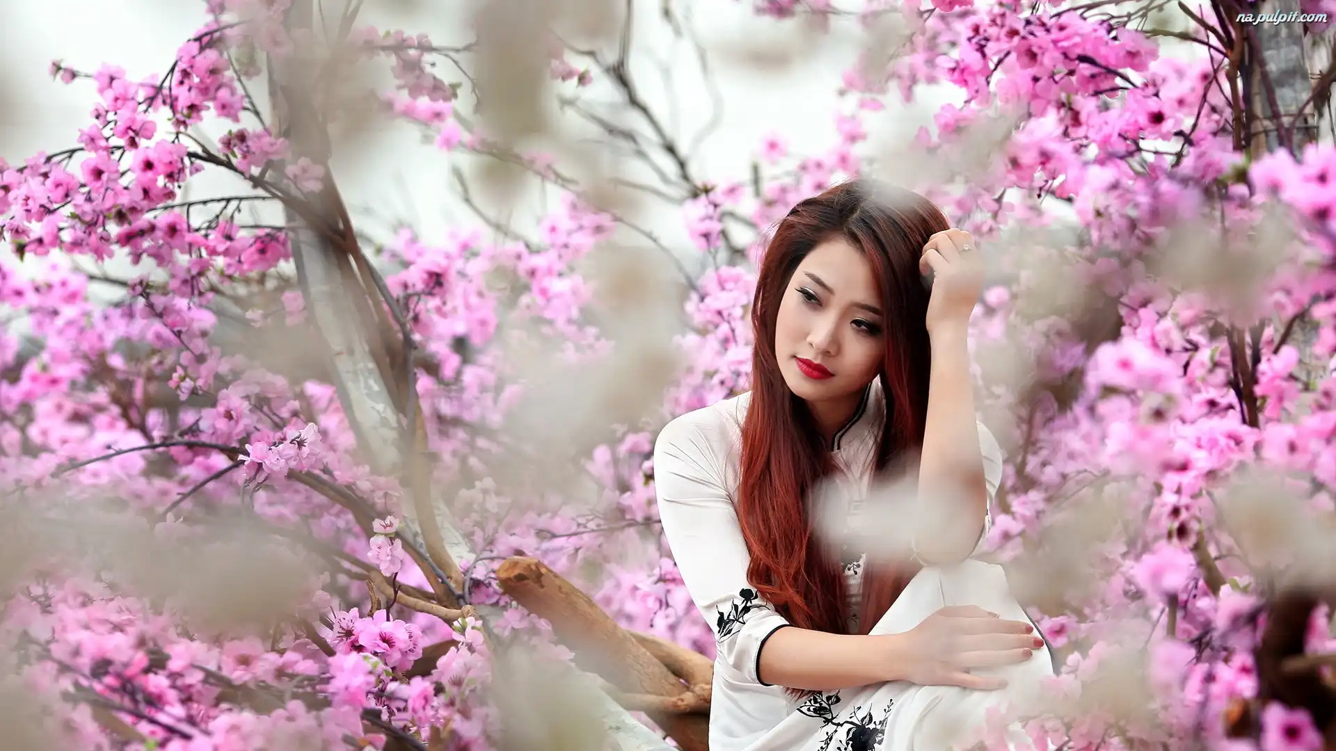 Kwiaty, Azjatka, Kobieta, Drzewo Na Pulpit