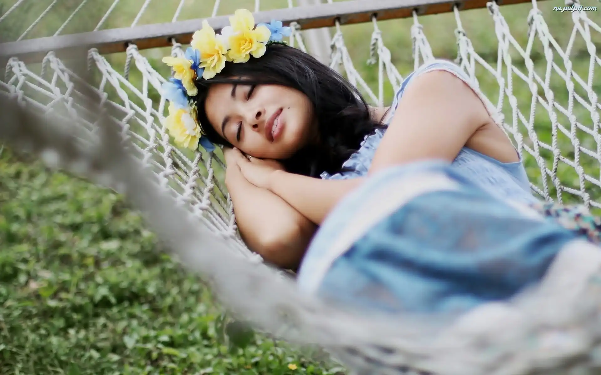 Kwiaty, Hamak, Kobieta, Wianek
