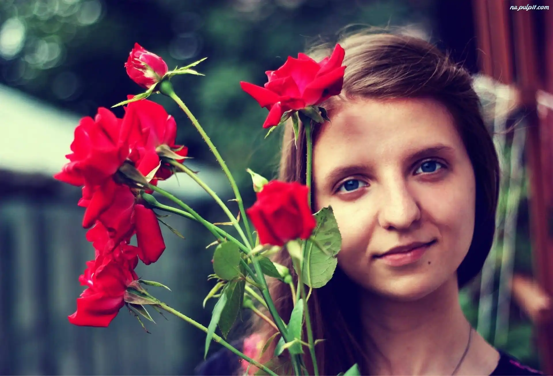 Kwiaty, Oczy, Niebieskie, Kobieta, Czerwone Na Pulpit