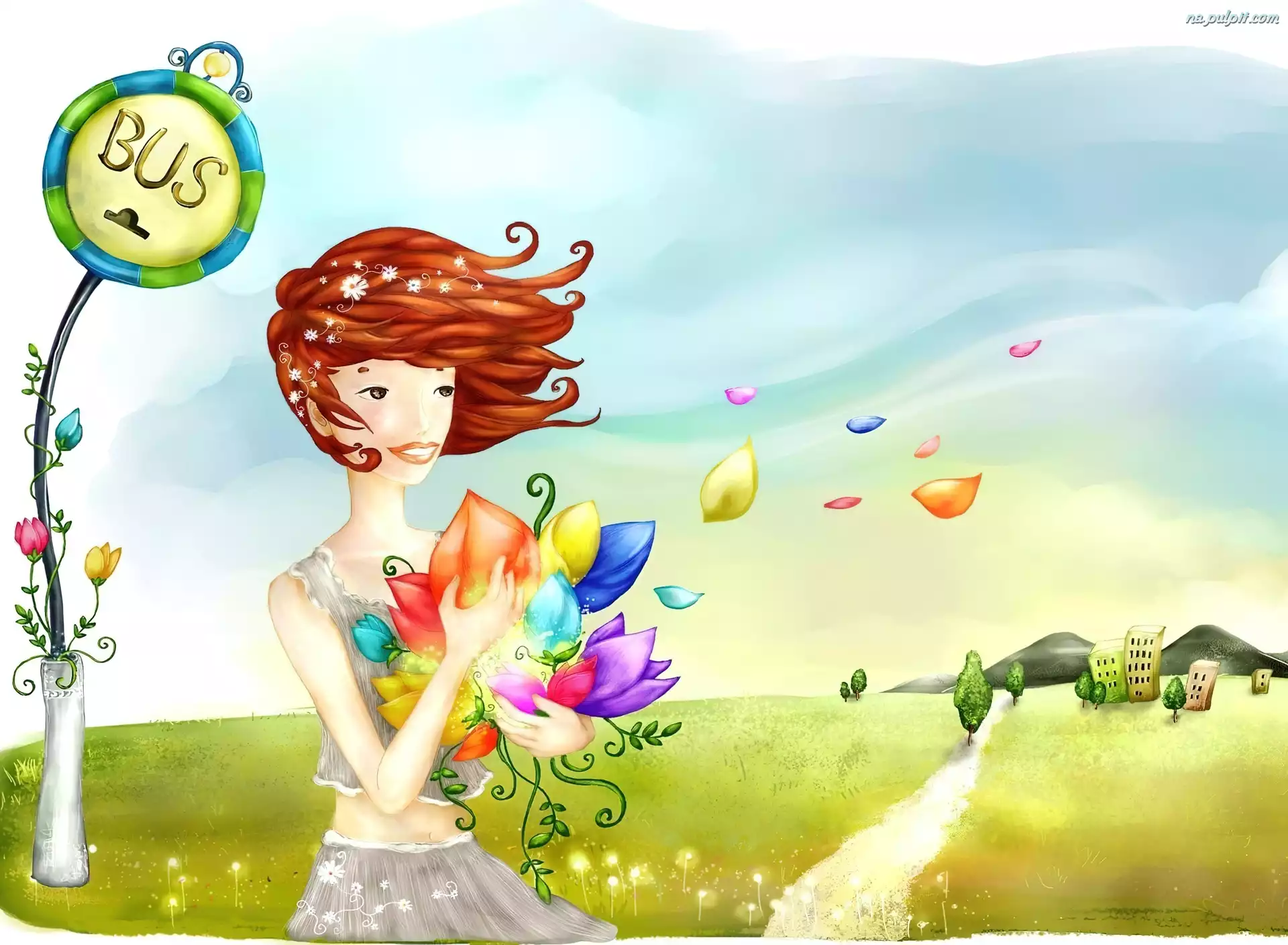 Kwiaty, Włosy, Rude, Kobieta, Przystanek