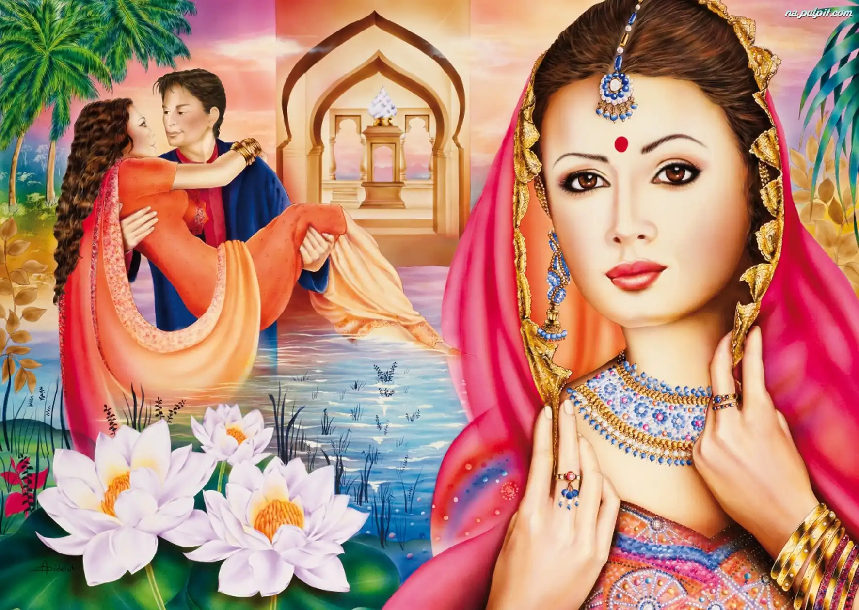 Kwiaty, Para, Tilaka, Kobieta, Woda