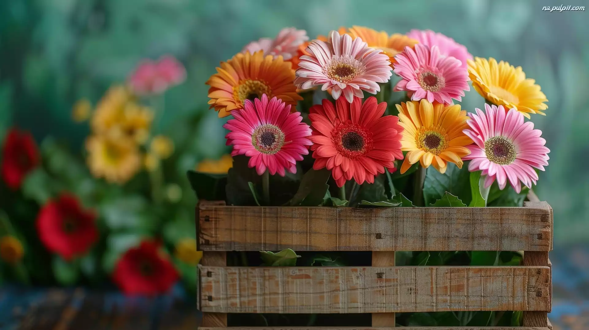 Drewniana, Kwiaty, Kolorowe, Skrzynka, Gerbery