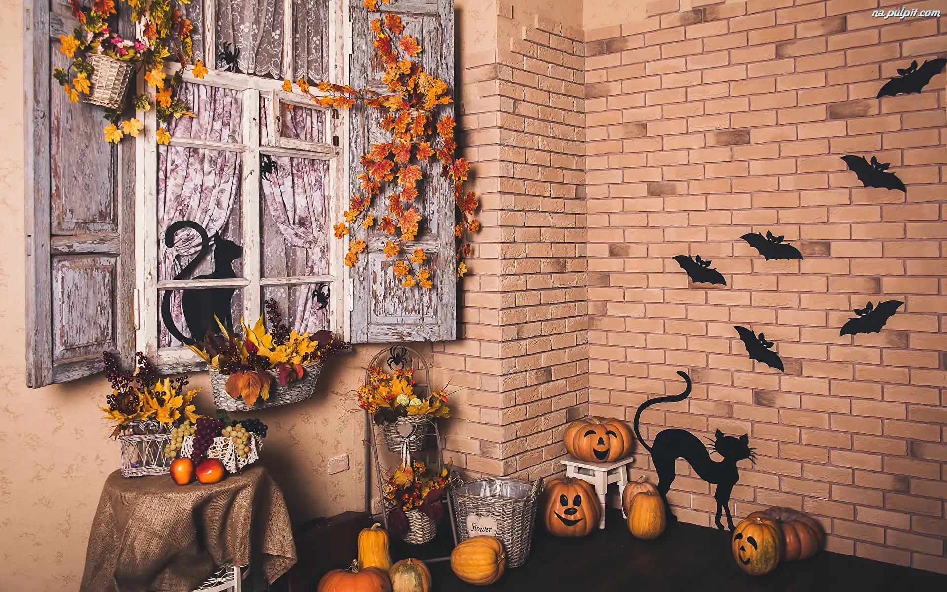 Koty czarne, Dom, Dynie, Koszyki, Liście, Nietoperze, Ozdoby, Halloween, Kwiaty