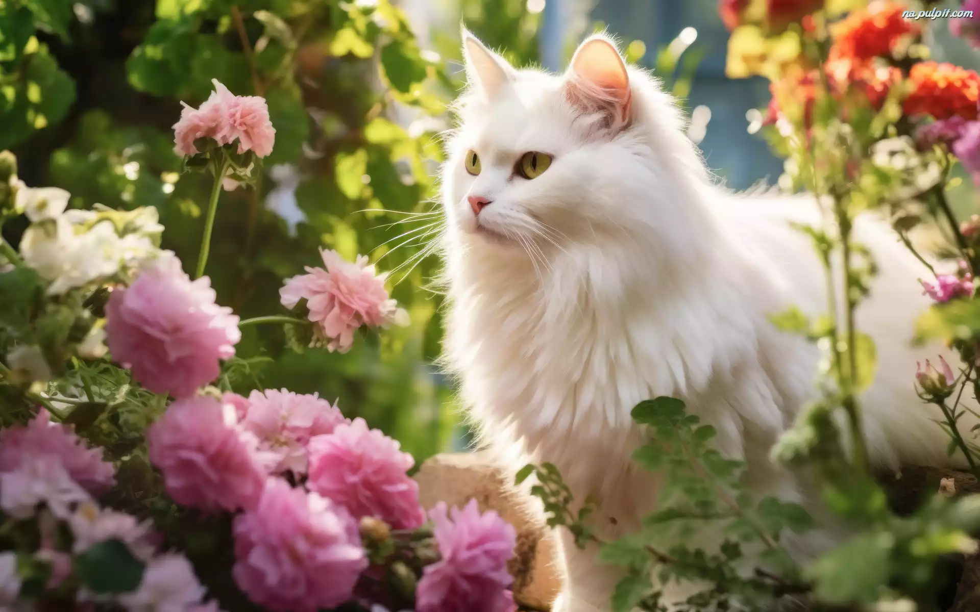 Kot, Biały, Spojrzenie, Kwiaty Na Pulpit