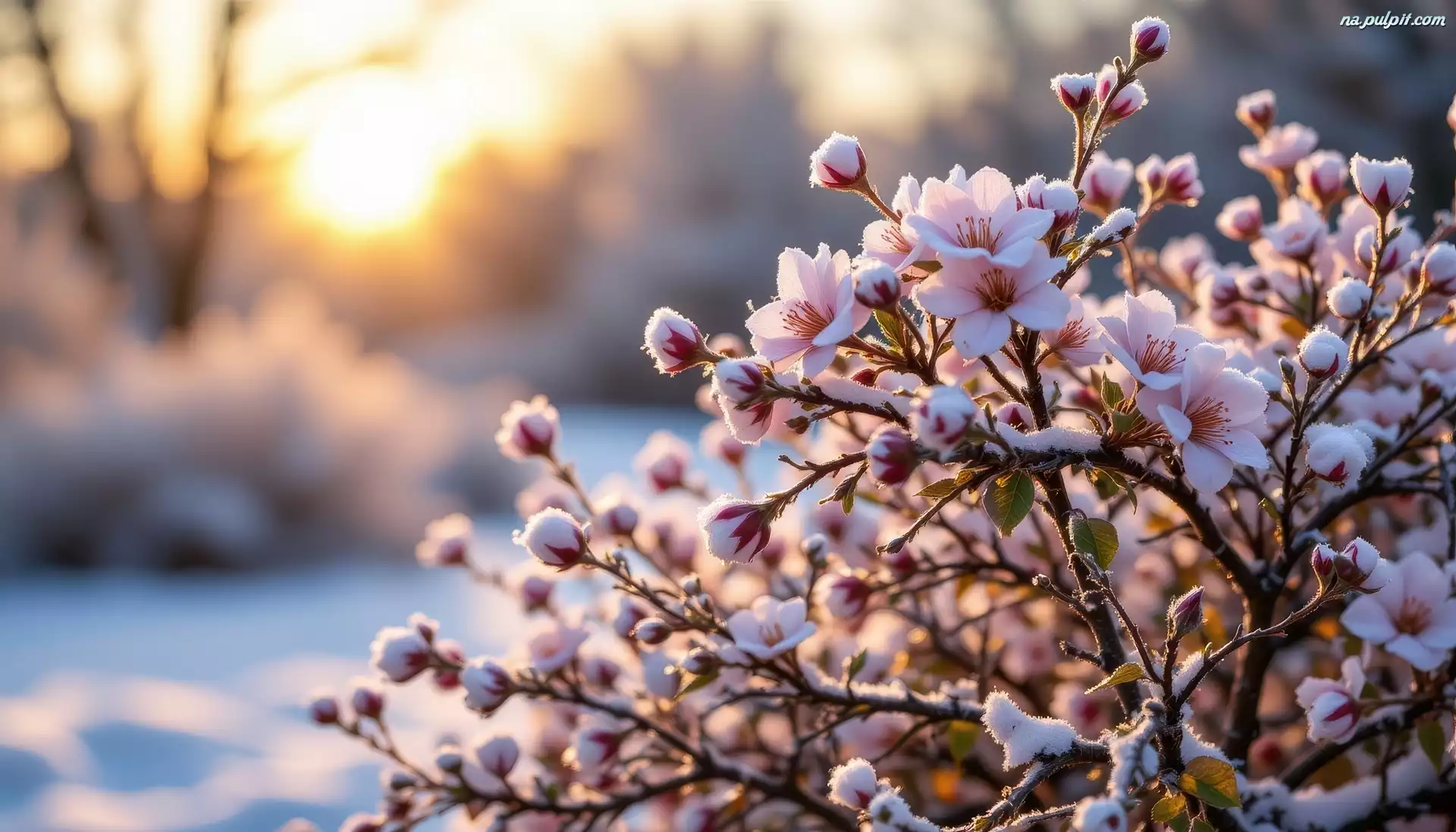 Ośnieżone, Kwiaty, Krzew, Grafika AI Na Pulpit