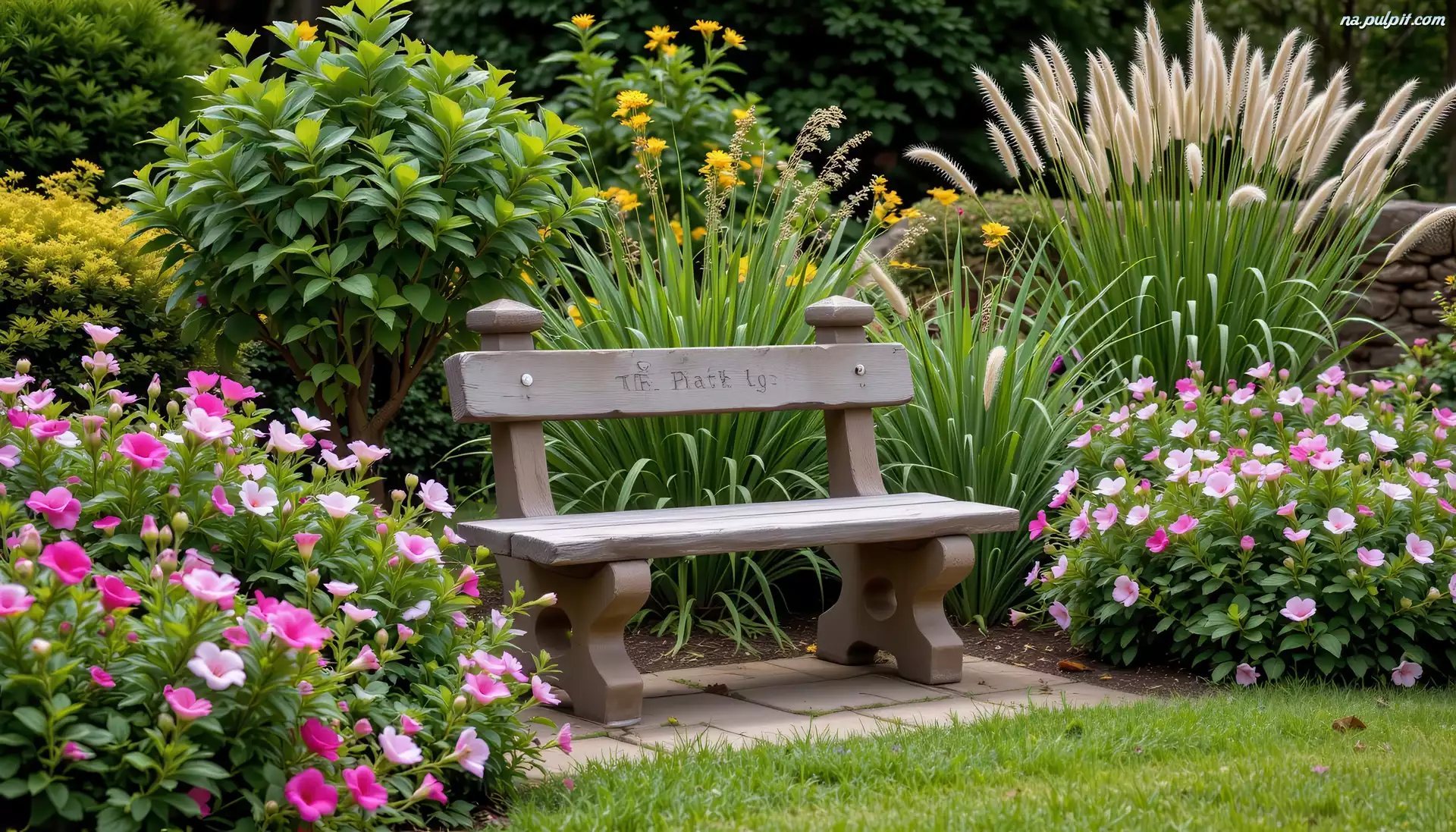 Trawa, Kwitnące, Krzewy, Ogród, Rośliny, AI, Ławka, Kwiaty Na Pulpit