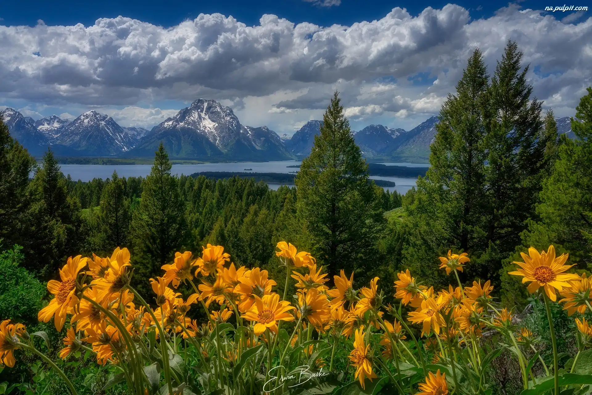 Las, Góry Teton Range, Łąka, Stany Zjednoczone, Balsamorhiza, Kwiaty, Park Narodowy Grand Teton, Drzewa Na Pulpit |