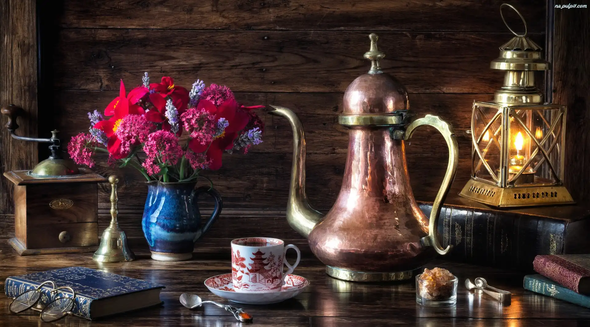 Książki, Kwiaty, Dzbanek, Filiżanka, Kompozycja, Młynek, Bukiet, Lampion
