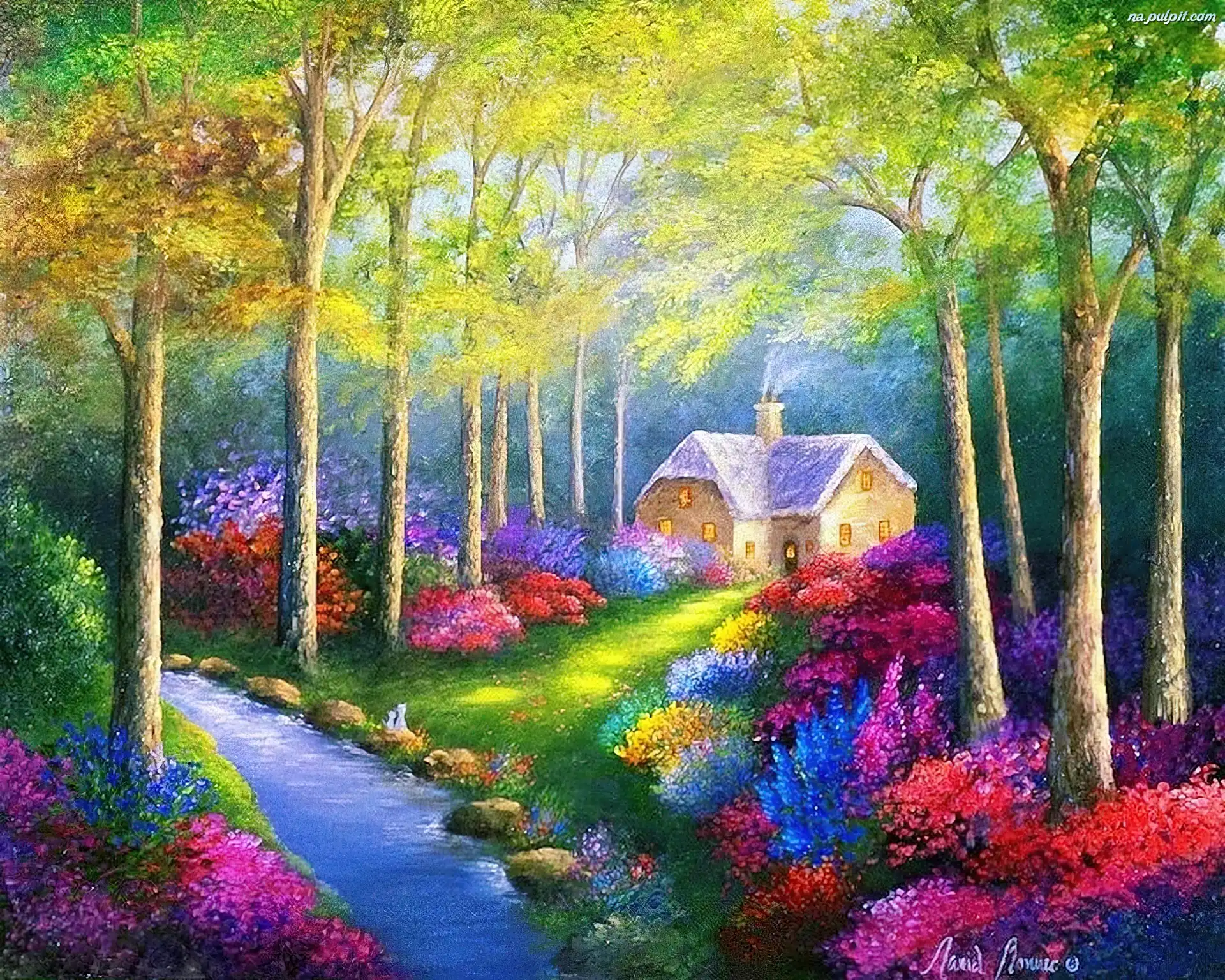 Kwiaty, Domek, Las, Rzeka Na Pulpit