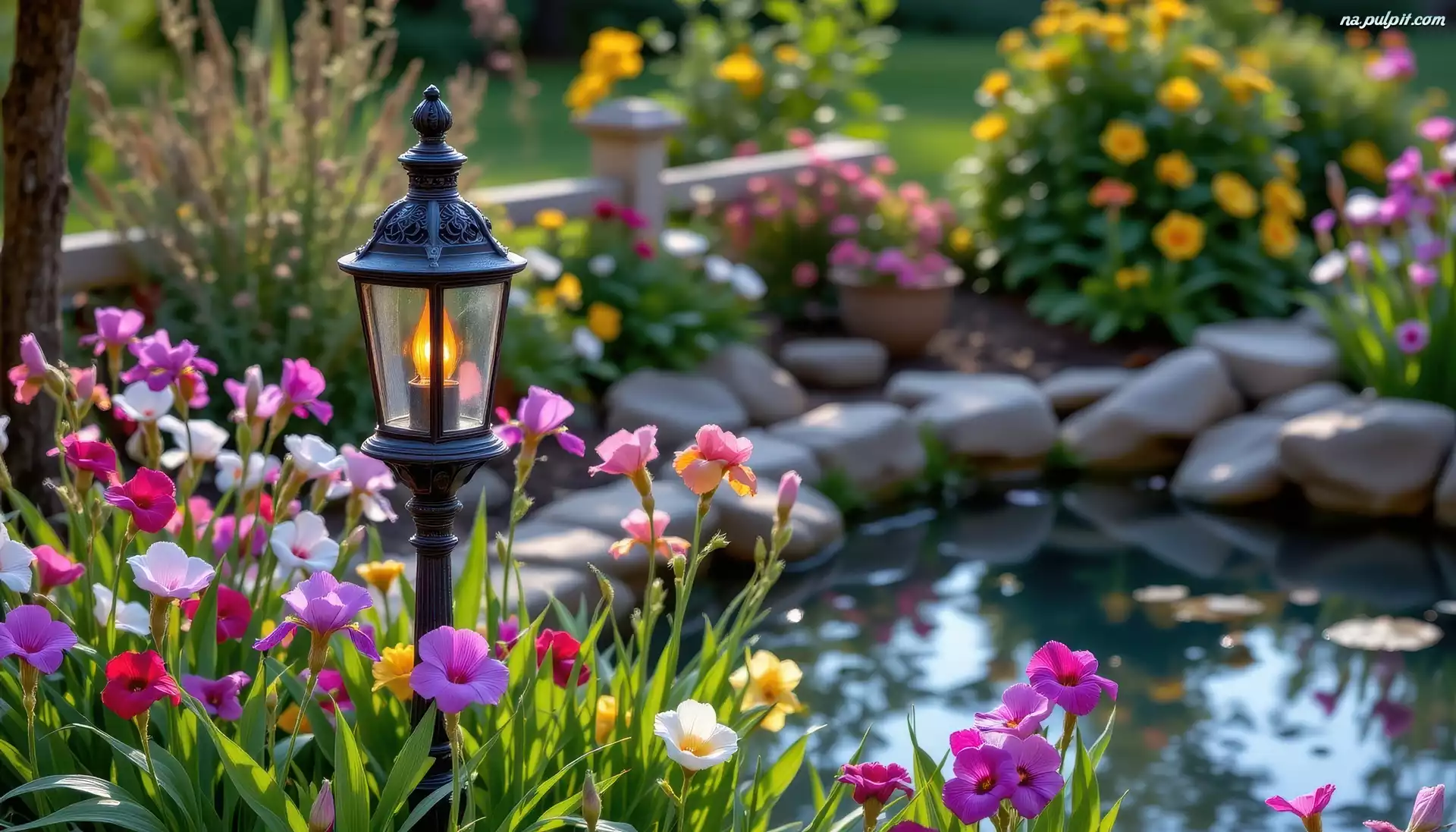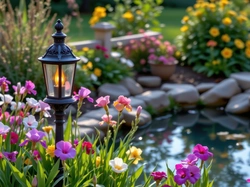 Oczko wodne, Latarnia, Kwiaty, Grafika AI, Ogród Na Pulpit