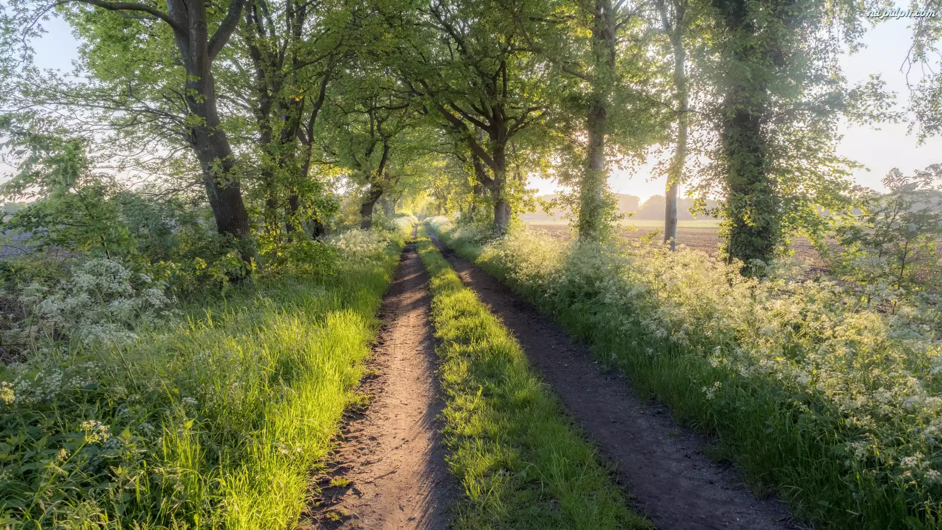 Poranek, Droga, Trawa, Kwiaty, Drzewa, Lato