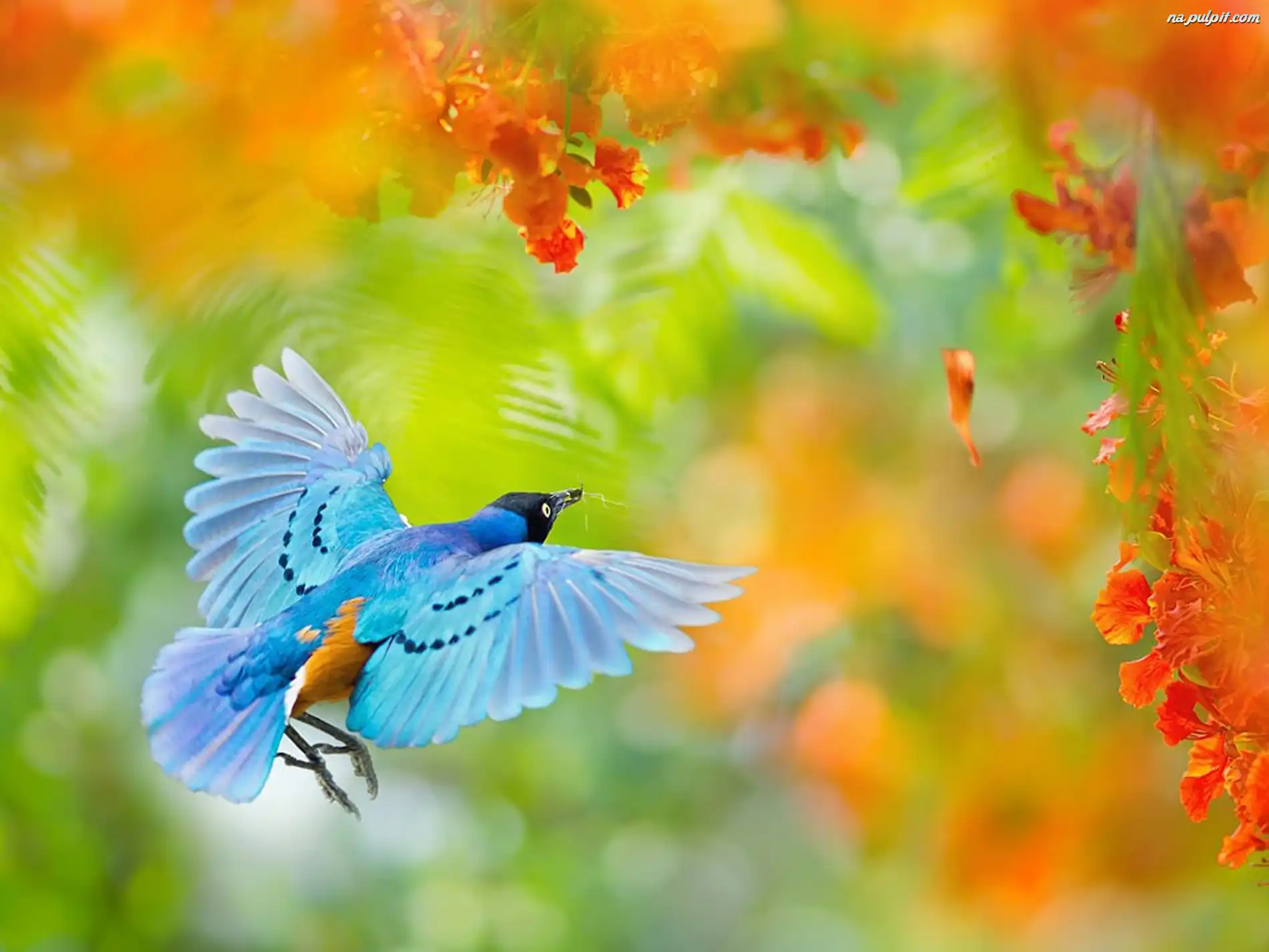 Kwiaty, Ptak, Niebieski, Makro, Pomarańczowe Na Pulpit