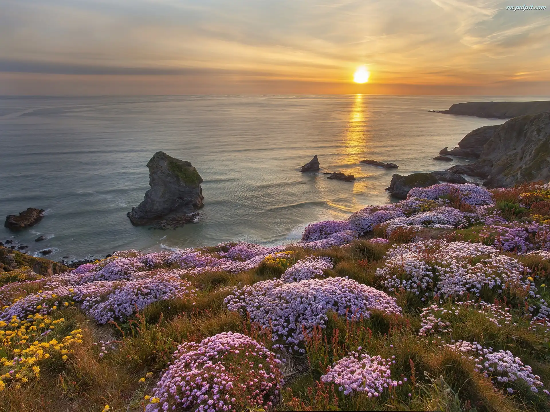 Kwiaty, Słońca, Zachód, Morze, Skały Na Pulpit
