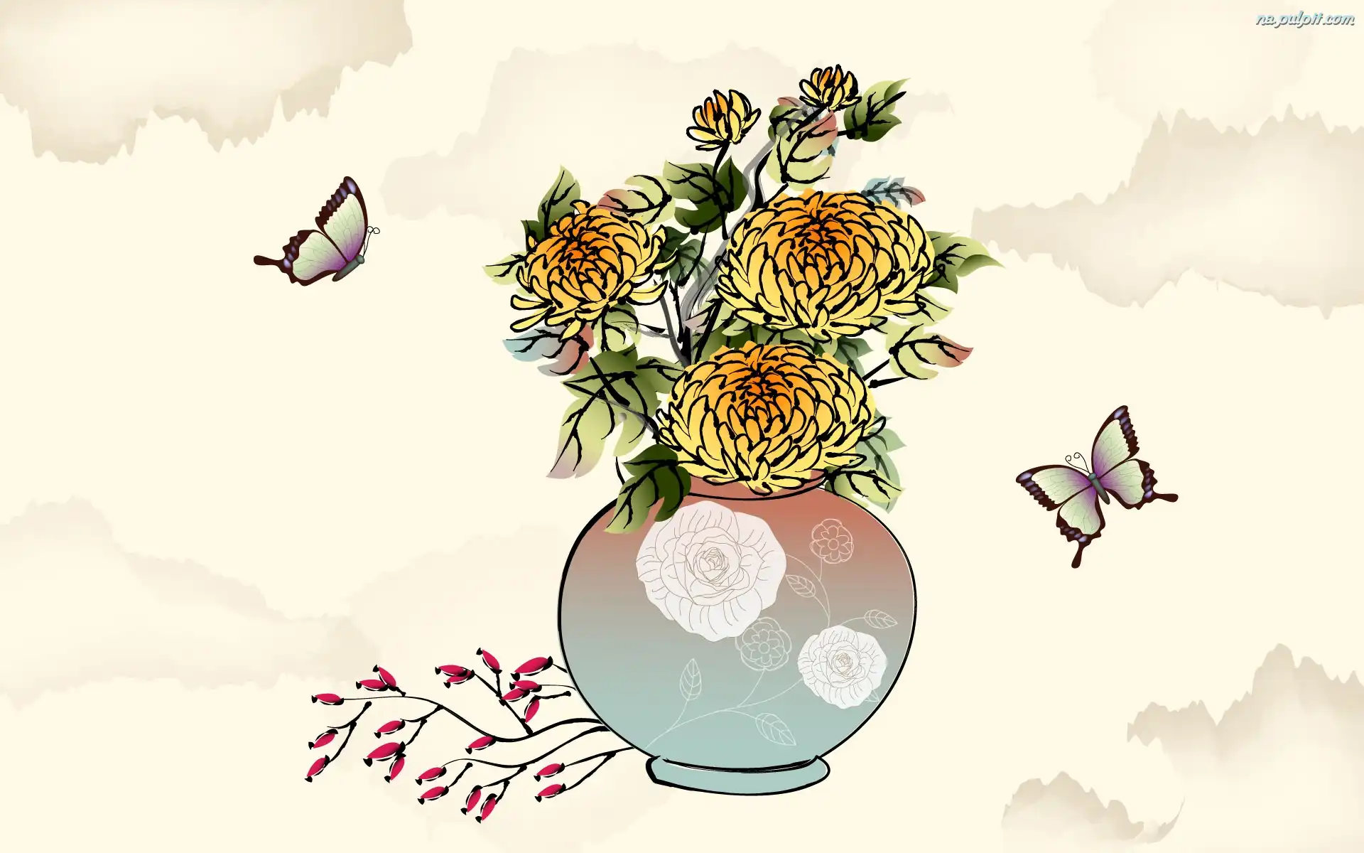 Motyle, Kwiaty, Wazon