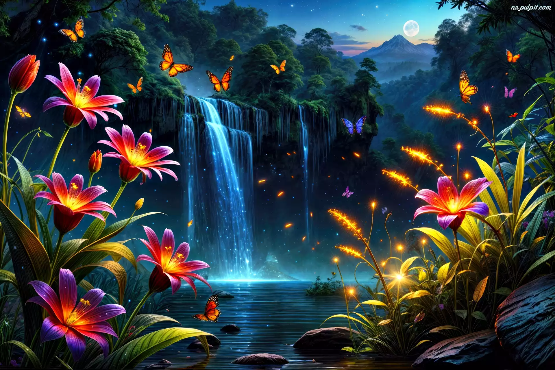Drzewa, Kwiaty, Motyle, Grafika, Wodospad Na Pulpit