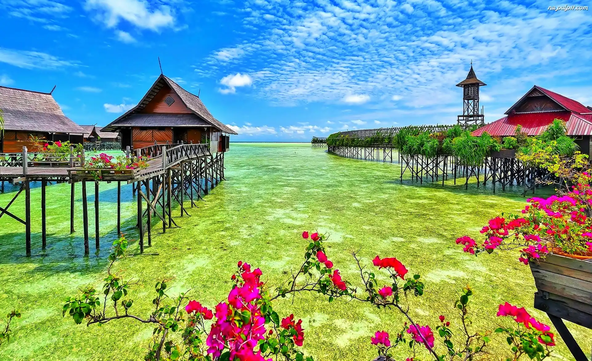 Kwiaty, Domki, Obłoki, Morze, Na Wodzie Na Pulpit