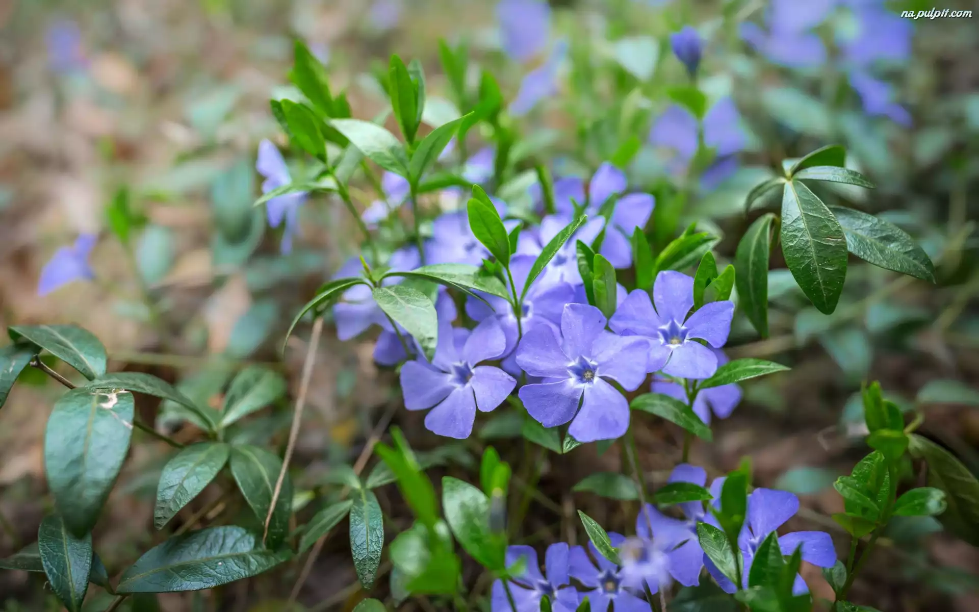 Liście, Kwiaty, Niebieski, Bokeh, Barwinek Na Pulpit