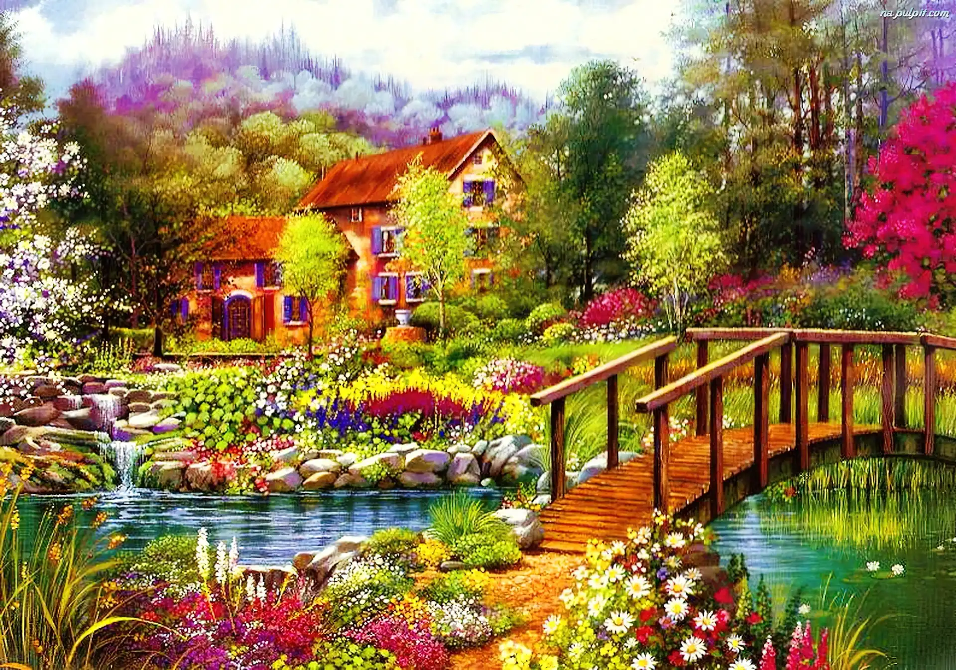 Kwiaty, Rzeka, Mostek, Ogród, Dom Na Pulpit